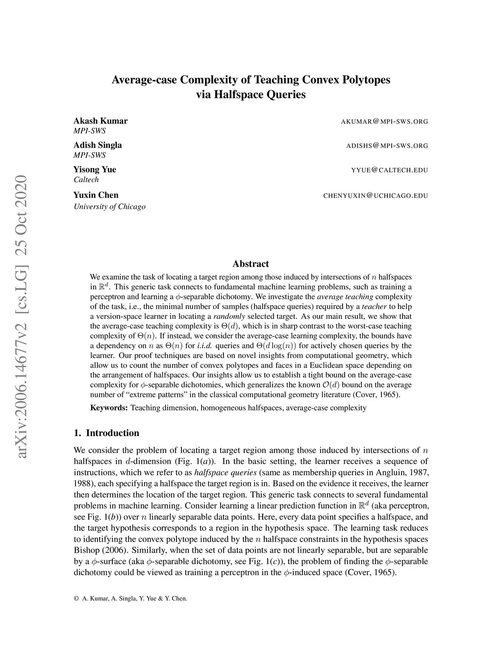 We examine the task of locating a target region among those induced by intersections of halfspaces in . This generic task connects to fundamental machine learning problems, such as training a perceptron and learning a -separable dichotomy. We investigate the average teaching complexity of the task, i.e., the minimal number of samples (halfspace queries) required by a teacher to help a version-space learner in locating a randomly selected target. As our main result, we show that the average-case teaching complexity is , which is in sharp contrast to the worst-case teaching complexity of . If instead, we consider the average-case learning complexity, the bounds have a dependency on as for \tt{i.i.d.} queries and for actively chosen queries by the learner. Our proof techniques are based on novel insights from computational geometry, which allow us to count the number of convex polytopes and faces in a Euclidean space depending on the arrangement of halfspaces. Our insights allow us to establish a tight bound on the average-case complexity for -separable dichotomies, which generalizes the known bound on the average number of "extreme patterns" in the classical computational geometry literature (Cover, 1965).