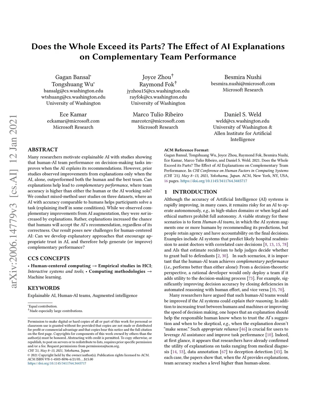 Many researchers motivate explainable AI with studies showing that human-AI team performance on decision-making tasks improves when the AI explains its recommendations. However, prior studies observed improvements from explanations only when the AI, alone, outperformed both the human and the best team. Can explanations help lead to complementary performance, where team accuracy is higher than either the human or the AI working solo? We conduct mixed-method user studies on three datasets, where an AI with accuracy comparable to humans helps participants solve a task (explaining itself in some conditions). While we observed complementary improvements from AI augmentation, they were not increased by explanations. Rather, explanations increased the chance that humans will accept the AI's recommendation, regardless of its correctness. Our result poses new challenges for human-centered AI: Can we develop explanatory approaches that encourage appropriate trust in AI, and therefore help generate (or improve) complementary performance?