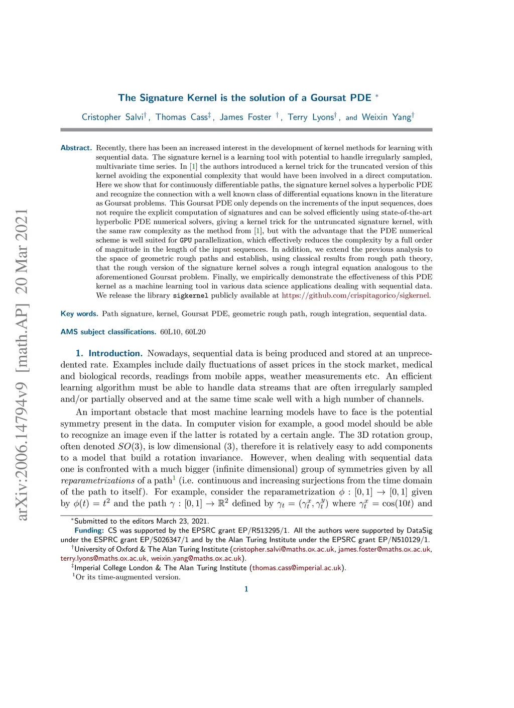 Recently, there has been an increased interest in the development of kernel methods for learning with sequential data. The signature kernel is a learning tool with potential to handle irregularly sampled, multivariate time series. In "Kernels for sequentially ordered data" the authors introduced a kernel trick for the truncated version of this kernel avoiding the exponential complexity that would have been involved in a direct computation. Here we show that for continuously differentiable paths, the signature kernel solves a hyperbolic PDE and recognize the connection with a well known class of differential equations known in the literature as Goursat problems. This Goursat PDE only depends on the increments of the input sequences, does not require the explicit computation of signatures and can be solved efficiently using state-of-the-arthyperbolic PDE numerical solvers, giving a kernel trick for the untruncated signature kernel, with the same raw complexity as the method from "Kernels for sequentially ordered data", but with the advantage that the PDE numerical scheme is well suited for GPU parallelization, which effectively reduces the complexity by a full order of magnitude in the length of the input sequences. In addition, we extend the previous analysis to the space of geometric rough paths and establish, using classical results from rough path theory, that the rough version of the signature kernel solves a rough integral equation analogous to the aforementioned Goursat PDE. Finally, we empirically demonstrate the effectiveness of our PDE kernel as a machine learning tool in various machine learning applications dealing with sequential data. We release the library sigkernel publicly available at https://github.com/crispitagorico/sigkernel.