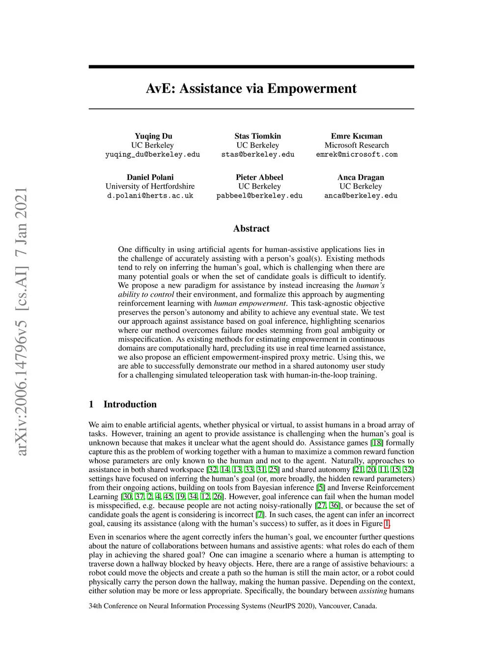 One difficulty in using artificial agents for human-assistive applications lies in the challenge of accurately assisting with a person's goal(s). Existing methods tend to rely on inferring the human's goal, which is challenging when there are many potential goals or when the set of candidate goals is difficult to identify. We propose a new paradigm for assistance by instead increasing the human's ability to control their environment, and formalize this approach by augmenting reinforcement learning with human empowerment. This task-agnostic objective preserves the person's autonomy and ability to achieve any eventual state. We test our approach against assistance based on goal inference, highlighting scenarios where our method overcomes failure modes stemming from goal ambiguity or misspecification. As existing methods for estimating empowerment in continuous domains are computationally hard, precluding its use in real time learned assistance, we also propose an efficient empowerment-inspired proxy metric. Using this, we are able to successfully demonstrate our method in a shared autonomy user study for a challenging simulated teleoperation task with human-in-the-loop training.