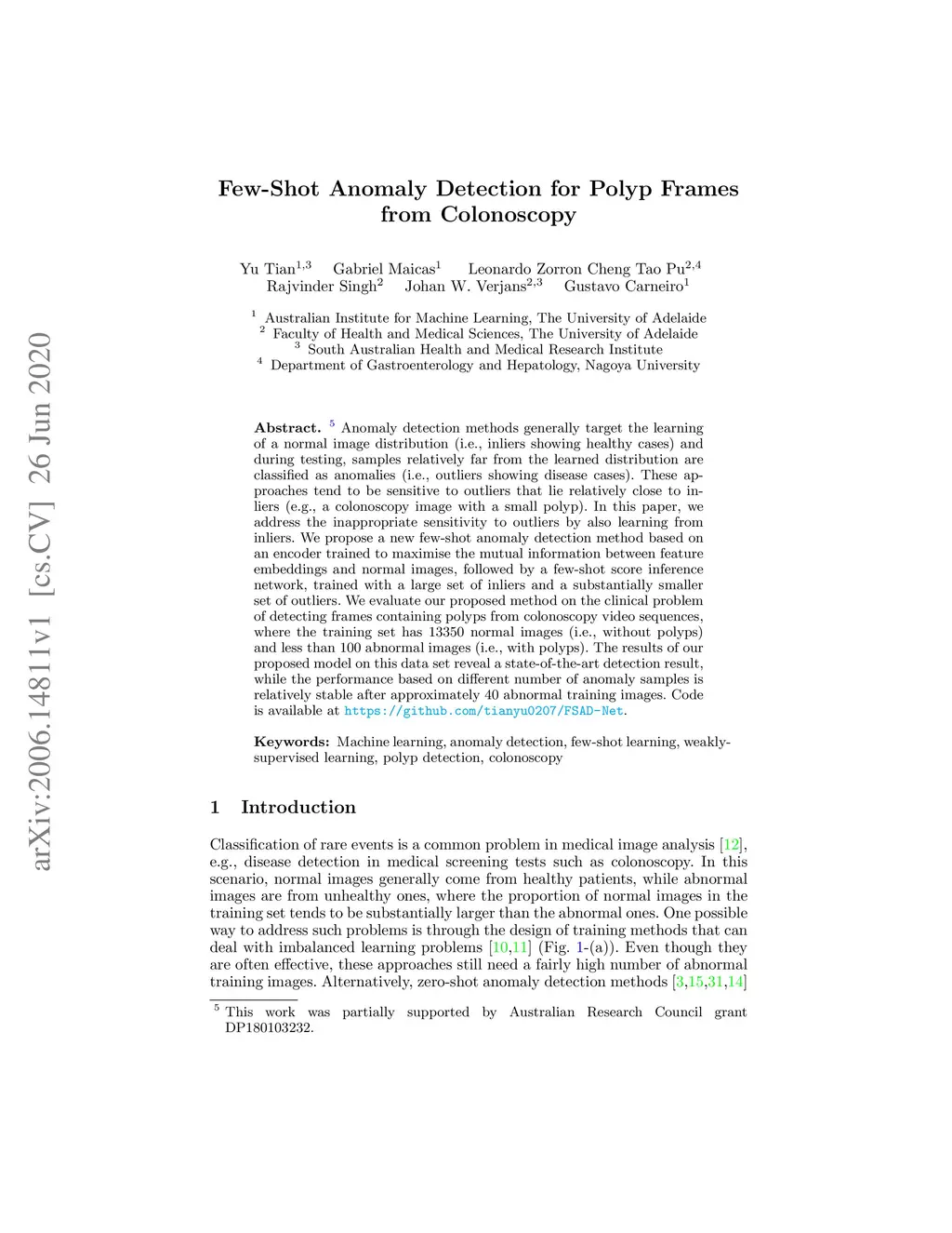 Few-Shot Anomaly Detection for Polyp Frames from Colonoscopy