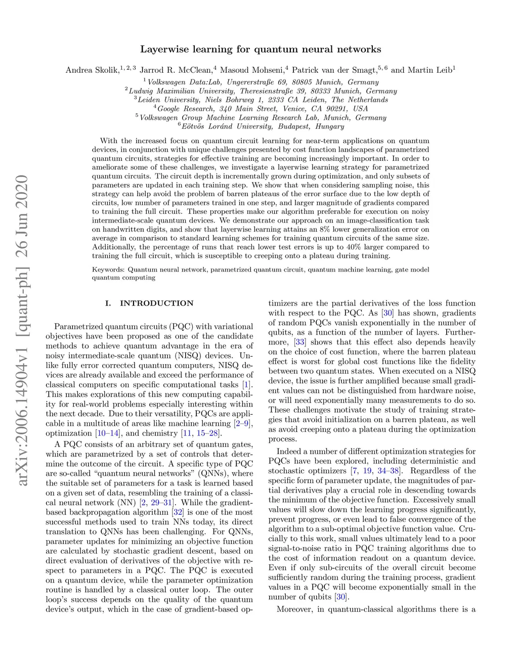 With the increased focus on quantum circuit learning for near-term applications on quantum devices, in conjunction with unique challenges presented by cost function landscapes of parametrized quantum circuits, strategies for effective training are becoming increasingly important. In order to ameliorate some of these challenges, we investigate a layerwise learning strategy for parametrized quantum circuits. The circuit depth is incrementally grown during optimization, and only subsets of parameters are updated in each training step. We show that when considering sampling noise, this strategy can help avoid the problem of barren plateaus of the error surface due to the low depth of circuits, low number of parameters trained in one step, and larger magnitude of gradients compared to training the full circuit. These properties make our algorithm preferable for execution on noisy intermediate-scale quantum devices. We demonstrate our approach on an image-classification task on handwritten digits, and show that layerwise learning attains an 8% lower generalization error on average in comparison to standard learning schemes for training quantum circuits of the same size. Additionally, the percentage of runs that reach lower test errors is up to 40% larger compared to training the full circuit, which is susceptible to creeping onto a plateau during training.