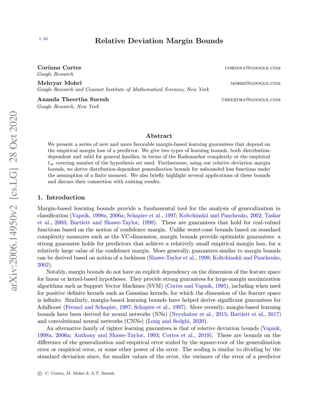 We present a series of new and more favorable margin-based learning guarantees that depend on the empirical margin loss of a predictor. We give two types of learning bounds, both distribution-dependent and valid for general families, in terms of the Rademacher complexity or the empirical covering number of the hypothesis set used. Furthermore, using our relative deviation margin bounds, we derive distribution-dependent generalization bounds for unbounded loss functions under the assumption of a finite moment. We also briefly highlight several applications of these bounds and discuss their connection with existing results.