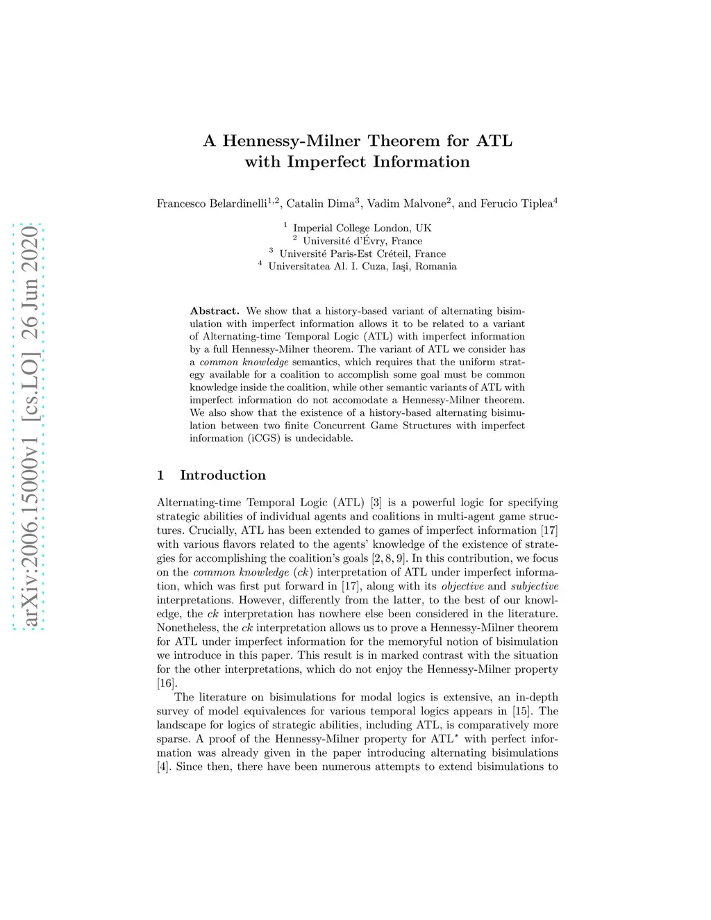 We show that a history-based variant of alternating bisimulation with imperfect information allows it to be related to a variant of Alternating-time Temporal Logic (ATL) with imperfect information by a full Hennessy-Milner theorem. The variant of ATL we consider has a common knowledge semantics, which requires that the uniform strategy available for a coalition to accomplish some goal must be common knowledge inside the coalition, while other semantic variants of ATL with imperfect information do not accommodate a Hennessy-Milner theorem. We also show that the existence of a history-based alternating bisimulation between two finite Concurrent Game Structures with imperfect information (iCGS) is undecidable.