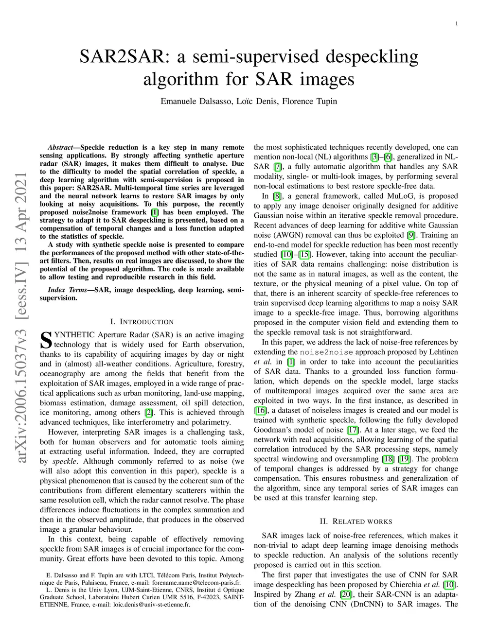 SAR2SAR: a semi-supervised despeckling algorithm for SAR images