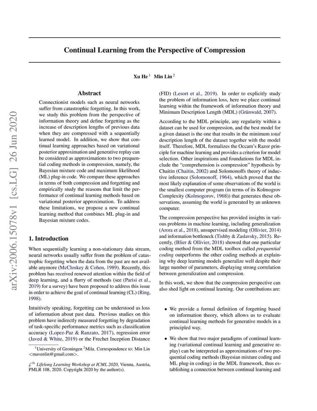 Connectionist models such as neural networks suffer from catastrophic forgetting. In this work, we study this problem from the perspective of information theory and define forgetting as the increase of description lengths of previous data when they are compressed with a sequentially learned model. In addition, we show that continual learning approaches based on variational posterior approximation and generative replay can be considered as approximations to two prequential coding methods in compression, namely, the Bayesian mixture code and maximum likelihood (ML) plug-in code. We compare these approaches in terms of both compression and forgetting and empirically study the reasons that limit the performance of continual learning methods based on variational posterior approximation. To address these limitations, we propose a new continual learning method that combines ML plug-in and Bayesian mixture codes.