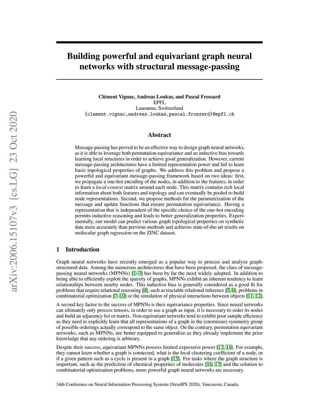 Message-passing has proved to be an effective way to design graph neural networks, as it is able to leverage both permutation equivariance and an inductive bias towards learning local structures in order to achieve good generalization. However, current message-passing architectures have a limited representation power and fail to learn basic topological properties of graphs. We address this problem and propose a powerful and equivariant message-passing framework based on two ideas: first, we propagate a one-hot encoding of the nodes, in addition to the features, in order to learn a local context matrix around each node. This matrix contains rich local information about both features and topology and can eventually be pooled to build node representations. Second, we propose methods for the parametrization of the message and update functions that ensure permutation equivariance. Having a representation that is independent of the specific choice of the one-hot encoding permits inductive reasoning and leads to better generalization properties. Experimentally, our model can predict various graph topological properties on synthetic data more accurately than previous methods and achieves state-of-the-art results on molecular graph regression on the ZINC dataset.