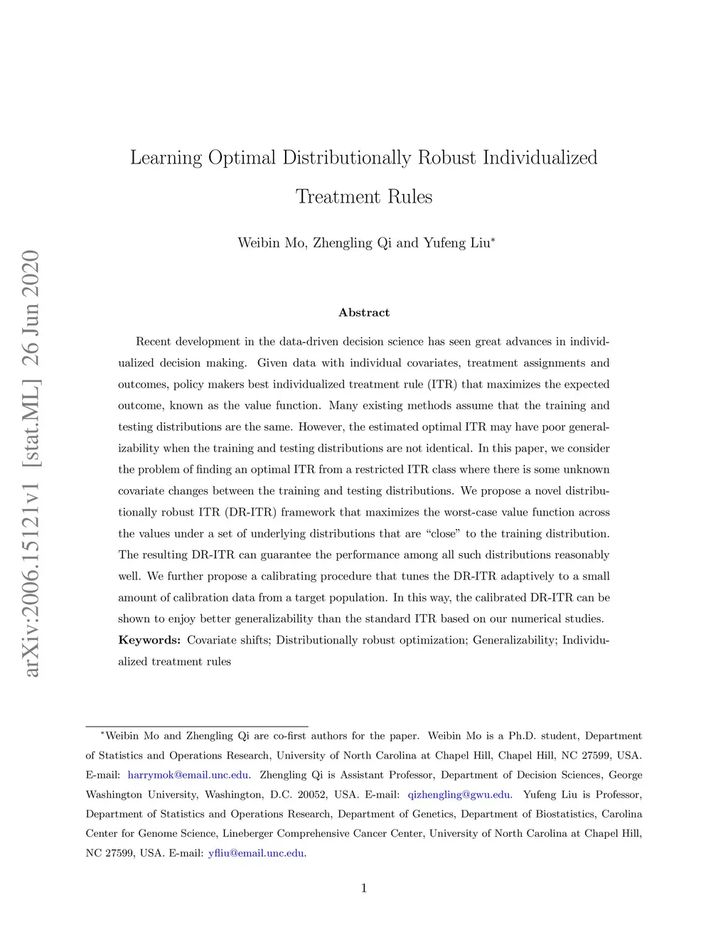 Recent development in the data-driven decision science has seen great advances in individualized decision making. Given data with individual covariates, treatment assignments and outcomes, policy makers best individualized treatment rule (ITR) that maximizes the expected outcome, known as the value function. Many existing methods assume that the training and testing distributions are the same. However, the estimated optimal ITR may have poor generalizability when the training and testing distributions are not identical. In this paper, we consider the problem of finding an optimal ITR from a restricted ITR class where there is some unknown covariate changes between the training and testing distributions. We propose a novel distributionally robust ITR (DR-ITR) framework that maximizes the worst-case value function across the values under a set of underlying distributions that are "close" to the training distribution. The resulting DR-ITR can guarantee the performance among all such distributions reasonably well. We further propose a calibrating procedure that tunes the DR-ITR adaptively to a small amount of calibration data from a target population. In this way, the calibrated DR-ITR can be shown to enjoy better generalizability than the standard ITR based on our numerical studies.