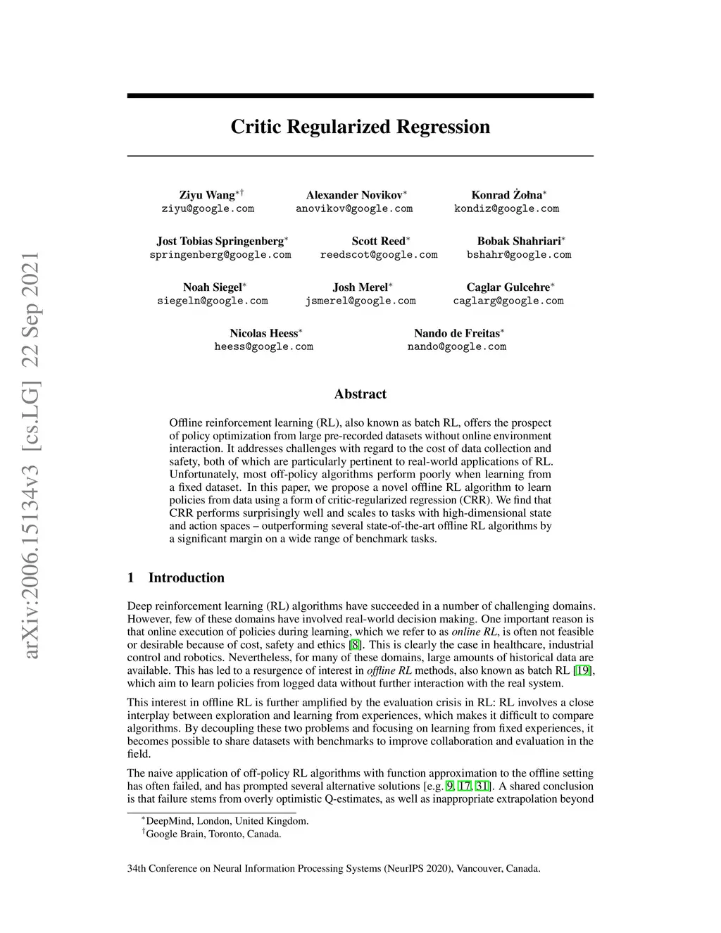 Offline reinforcement learning (RL), also known as batch RL, offers the prospect of policy optimization from large pre-recorded datasets without online environment interaction. It addresses challenges with regard to the cost of data collection and safety, both of which are particularly pertinent to real-world applications of RL. Unfortunately, most off-policy algorithms perform poorly when learning from a fixed dataset. In this paper, we propose a novel offline RL algorithm to learn policies from data using a form of critic-regularized regression (CRR). We find that CRR performs surprisingly well and scales to tasks with high-dimensional state and action spaces -- outperforming several state-of-the-art offline RL algorithms by a significant margin on a wide range of benchmark tasks.