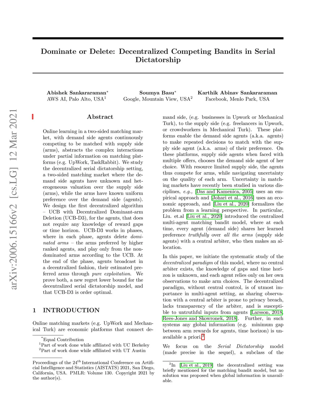 Online learning in a two-sided matching market, with demand side agents continuously competing to be matched with supply side (arms), abstracts the complex interactions under partial information on matching platforms (e.g. UpWork, TaskRabbit). We study the decentralized serial dictatorship setting, a two-sided matching market where the demand side agents have unknown and heterogeneous valuation over the supply side (arms), while the arms have known uniform preference over the demand side (agents). We design the first decentralized algorithm -- UCB with Decentralized Dominant-arm Deletion (UCB-D3), for the agents, that does not require any knowledge of reward gaps or time horizon. UCB-D3 works in phases, where in each phase, agents delete \emph{dominated arms} -- the arms preferred by higher ranked agents, and play only from the non-dominated arms according to the UCB. At the end of the phase, agents broadcast in a decentralized fashion, their estimated preferred arms through {\em pure exploitation}. We prove both, a new regret lower bound for the decentralized serial dictatorship model, and that UCB-D3 is order optimal.