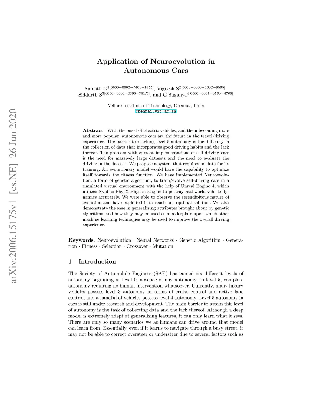 With the onset of Electric vehicles, and them becoming more and more popular, autonomous cars are the future in the travel/driving experience. The barrier to reaching level 5 autonomy is the difficulty in the collection of data that incorporates good driving habits and the lack thereof. The problem with current implementations of self-driving cars is the need for massively large datasets and the need to evaluate the driving in the dataset. We propose a system that requires no data for its training. An evolutionary model would have the capability to optimize itself towards the fitness function. We have implemented Neuroevolution, a form of genetic algorithm, to train/evolve self-driving cars in a simulated virtual environment with the help of Unreal Engine 4, which utilizes Nvidia's PhysX Physics Engine to portray real-world vehicle dynamics accurately. We were able to observe the serendipitous nature of evolution and have exploited it to reach our optimal solution. We also demonstrate the ease in generalizing attributes brought about by genetic algorithms and how they may be used as a boilerplate upon which other machine learning techniques may be used to improve the overall driving experience.