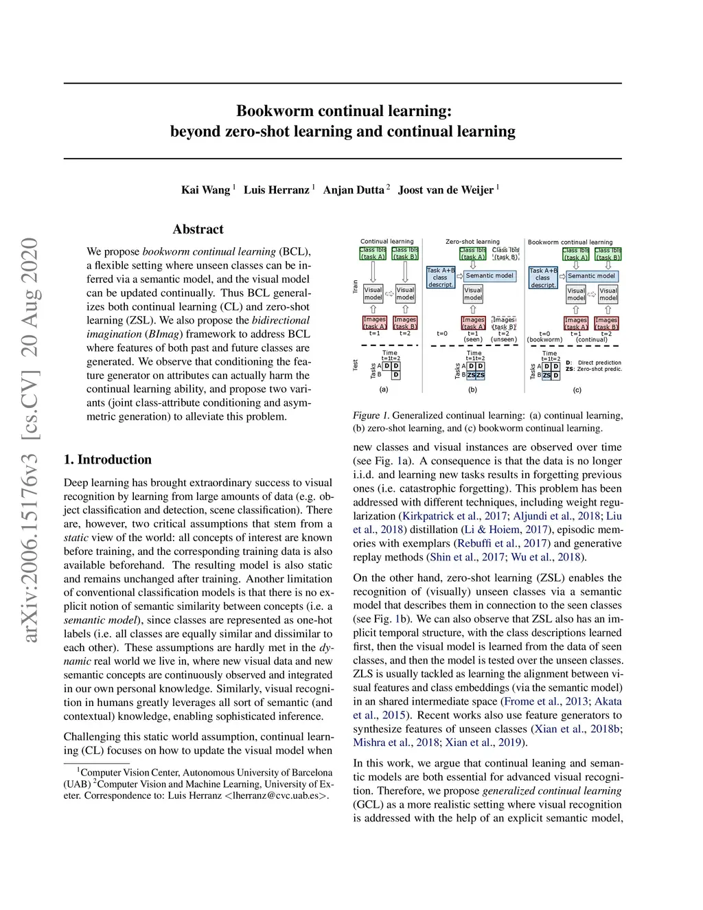 We propose bookworm continual learning(BCL), a flexible setting where unseen classes can be inferred via a semantic model, and the visual model can be updated continually. Thus BCL generalizes both continual learning (CL) and zero-shot learning (ZSL). We also propose the bidirectional imagination (BImag) framework to address BCL where features of both past and future classes are generated. We observe that conditioning the feature generator on attributes can actually harm the continual learning ability, and propose two variants (joint class-attribute conditioning and asymmetric generation) to alleviate this problem.