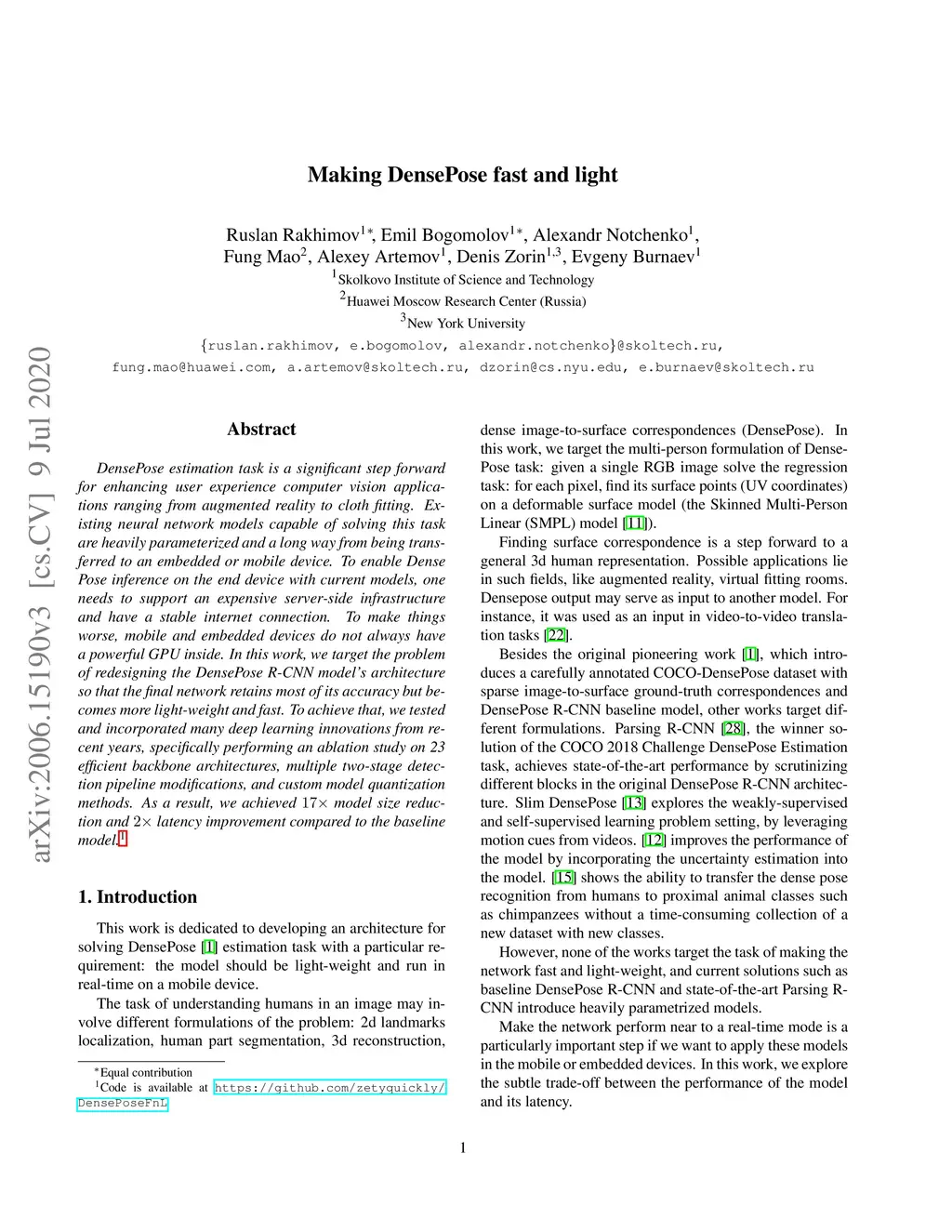 DensePose estimation task is a significant step forward for enhancing user experience computer vision applications ranging from augmented reality to cloth fitting. Existing neural network models capable of solving this task are heavily parameterized and a long way from being transferred to an embedded or mobile device. To enable Dense Pose inference on the end device with current models, one needs to support an expensive server-side infrastructure and have a stable internet connection. To make things worse, mobile and embedded devices do not always have a powerful GPU inside. In this work, we target the problem of redesigning the DensePose R-CNN model's architecture so that the final network retains most of its accuracy but becomes more light-weight and fast. To achieve that, we tested and incorporated many deep learning innovations from recent years, specifically performing an ablation study on 23 efficient backbone architectures, multiple two-stage detection pipeline modifications, and custom model quantization methods. As a result, we achieved model size reduction and latency improvement compared to the baseline model.
