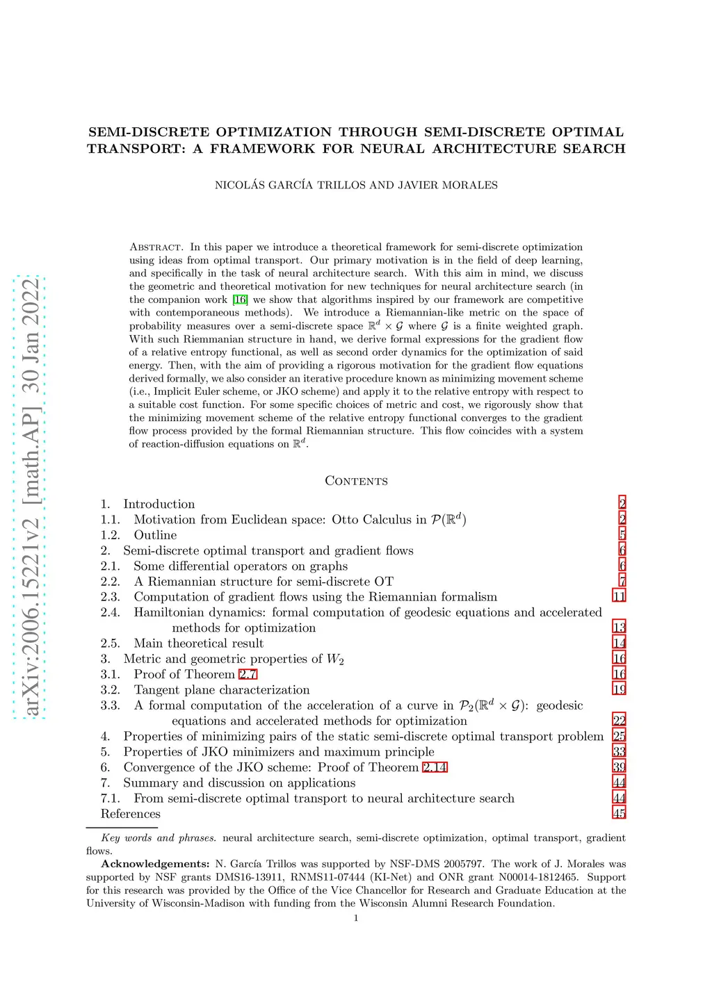 In this paper we introduce a theoretical framework for semi-discrete optimization using ideas from optimal transport. Our primary motivation is in the field of deep learning, and specifically in the task of neural architecture search. With this aim in mind, we discuss the geometric and theoretical motivation for new techniques for neural architecture search (in a companion paper we show that algorithms inspired by our framework are competitive with contemporaneous methods). We introduce a Riemannian-like metric on the space of probability measures over a semi-discrete space where is a finite weighted graph. With such Riemmanian structure in hand, we derive formal expressions for the gradient flow of a relative entropy functional, as well as second order dynamics for the optimization of said energy. Then, with the aim of providing a rigorous motivation for the gradient flow equations derived formally, we also consider an iterative procedure known as minimizing movement scheme (i.e., Implicit Euler scheme, or JKO scheme) and apply it to the relative entropy with respect to a suitable cost function. For some specific choices of metric and cost, we rigorously show that the minimizing movement scheme of the relative entropy functional converges to the gradient flow process provided by the formal Riemannian structure. This flow coincides with a system of reaction-diffusion equations on .
