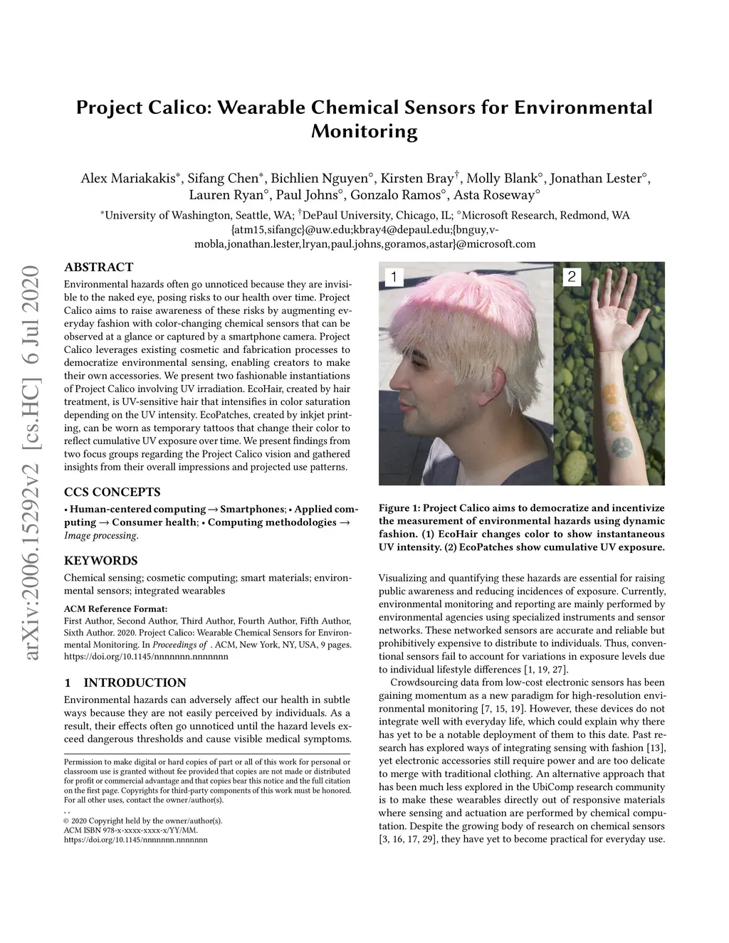 Environmental hazards often go unnoticed because they are invisible to the naked eye, posing risks to our health over time. Project Calico aims to raise awareness of these risks by augmenting everyday fashion with color-changing chemical sensors that can be observed at a glance or captured by a smartphone camera. Project Calico leverages existing cosmetic and fabrication processes to democratize environmental sensing, enabling creators to make their own accessories. We present two fashionable instantiations of Project Calico involving UV irradiation. EcoHair, created by hair treatment, is UV-sensitive hair that intensifies in color saturation depending on the UV intensity. EcoPatches, created by inkjet printing, can be worn as temporary tattoos that change their color to reflect cumulative UV exposure over time. We present findings from two focus groups regarding the Project Calico vision and gathered insights from their overall impressions and projected use patterns.