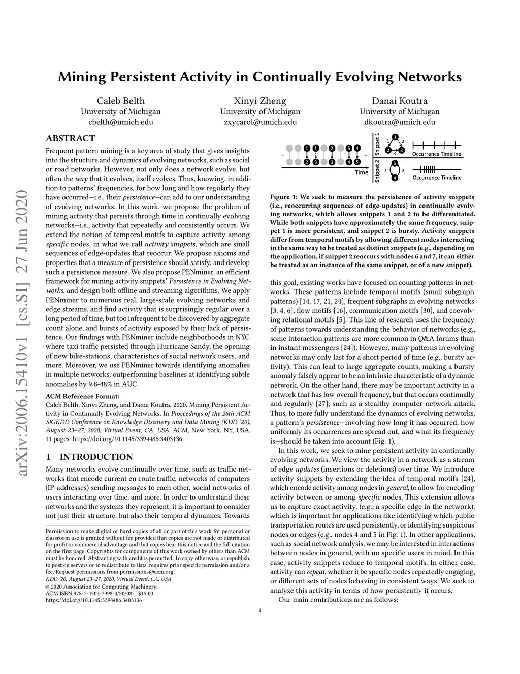 Frequent pattern mining is a key area of study that gives insights into the structure and dynamics of evolving networks, such as social or road networks. However, not only does a network evolve, but often the way that it evolves, itself evolves. Thus, knowing, in addition to patterns' frequencies, for how long and how regularly they have occurred---i.e., their persistence---can add to our understanding of evolving networks. In this work, we propose the problem of mining activity that persists through time in continually evolving networks---i.e., activity that repeatedly and consistently occurs. We extend the notion of temporal motifs to capture activity among specific nodes, in what we call activity snippets, which are small sequences of edge-updates that reoccur. We propose axioms and properties that a measure of persistence should satisfy, and develop such a persistence measure. We also propose PENminer, an efficient framework for mining activity snippets' Persistence in Evolving Networks, and design both offline and streaming algorithms. We apply PENminer to numerous real, large-scale evolving networks and edge streams, and find activity that is surprisingly regular over a long period of time, but too infrequent to be discovered by aggregate count alone, and bursts of activity exposed by their lack of persistence. Our findings with PENminer include neighborhoods in NYC where taxi traffic persisted through Hurricane Sandy, the opening of new bike-stations, characteristics of social network users, and more. Moreover, we use PENminer towards identifying anomalies in multiple networks, outperforming baselines at identifying subtle anomalies by 9.8-48% in AUC.
