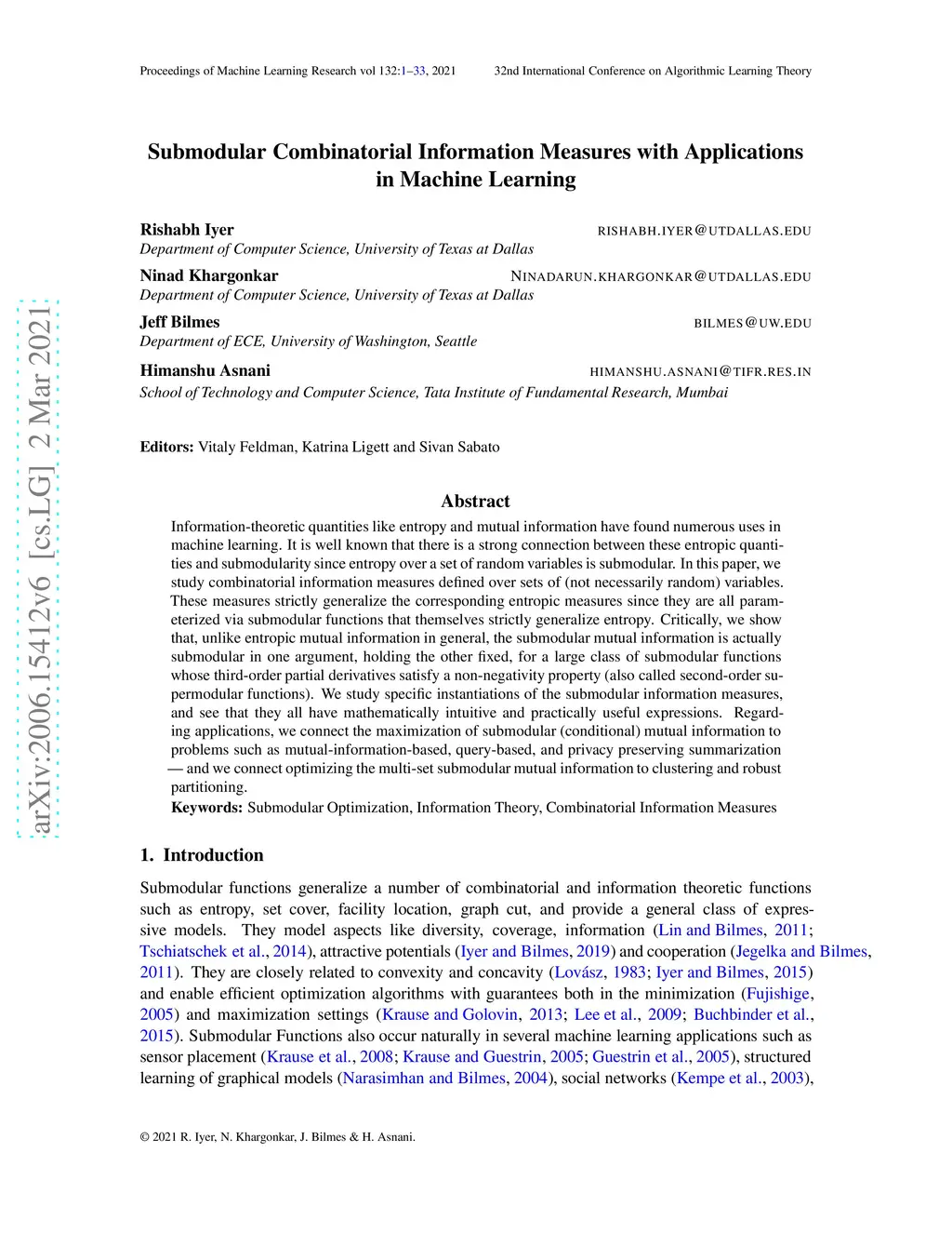 Information-theoretic quantities like entropy and mutual information have found numerous uses in machine learning. It is well known that there is a strong connection between these entropic quantities and submodularity since entropy over a set of random variables is submodular. In this paper, we study combinatorial information measures that generalize independence, (conditional) entropy, (conditional) mutual information, and total correlation defined over sets of (not necessarily random) variables. These measures strictly generalize the corresponding entropic measures since they are all parameterized via submodular functions that themselves strictly generalize entropy. Critically, we show that, unlike entropic mutual information in general, the submodular mutual information is actually submodular in one argument, holding the other fixed, for a large class of submodular functions whose third-order partial derivatives satisfy a non-negativity property. This turns out to include a number of practically useful cases such as the facility location and set-cover functions. We study specific instantiations of the submodular information measures on these, as well as the probabilistic coverage, graph-cut, and saturated coverage functions, and see that they all have mathematically intuitive and practically useful expressions. Regarding applications, we connect the maximization of submodular (conditional) mutual information to problems such as mutual-information-based, query-based, and privacy-preserving summarization -- and we connect optimizing the multi-set submodular mutual information to clustering and robust partitioning.
