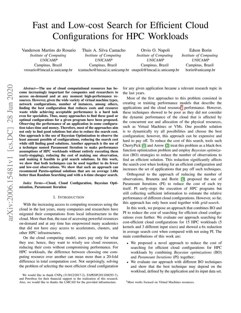 The use of cloud computational resources has become increasingly important for companies and researchers to access on-demand and at any moment high-performance resources. However, given the wide variety of virtual machine types, network configurations, number of instances, among others, finding the best configuration that reduces costs and resource waste while achieving acceptable performance is a hard task even for specialists. Thus, many approaches to find these good or optimal configurations for a given program have been proposed. Observing the performance of an application in some configuration takes time and money. Therefore, most of the approaches aim not only to find good solutions but also to reduce the search cost. One approach is the use of Bayesian Optimization to observe the least amount possible of configurations, reducing the search cost while still finding good solutions. Another approach is the use of a technique named Paramount Iteration to make performance assumptions of HPC workloads without entirely executing them (early-stopping), reducing the cost of making one observation, and making it feasible to grid search solutions. In this work, we show that both techniques can be used together to do fewer and low-cost observations. We show that such an approach can recommend Pareto-optimal solutions that are on average 1.68x better than Random Searching and with a 6-time cheaper search.