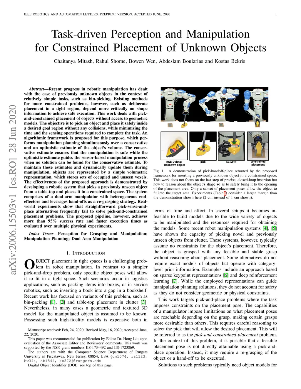 Recent progress in robotic manipulation has dealt with the case of previously unknown objects in the context of relatively simple tasks, such as bin-picking. Existing methods for more constrained problems, however, such as deliberate placement in a tight region, depend more critically on shape information to achieve safe execution. This work deals with pick-and-constrained placement of objects without access to geometric models. The objective is to pick an object and place it safely inside a desired goal region without any collisions, while minimizing the time and the sensing operations required to complete the task. An algorithmic framework is proposed for this purpose, which performs manipulation planning simultaneously over a conservative and an optimistic estimate of the object's volume. The conservative estimate ensures that the manipulation is safe while the optimistic estimate guides the sensor-based manipulation process when no solution can be found for the conservative estimate. To maintain these estimates and dynamically update them during manipulation, objects are represented by a simple volumetric representation, which stores sets of occupied and unseen voxels. The effectiveness of the proposed approach is demonstrated by developing a robotic system that picks a previously unseen object from a table-top and places it in a constrained space. The system comprises of a dual-arm manipulator with heterogeneous end-effectors and leverages hand-offs as a re-grasping strategy. Real-world experiments show that straightforward pick-sense-and-place alternatives frequently fail to solve pick-and-constrained placement problems. The proposed pipeline, however, achieves more than 95% success rate and faster execution times as evaluated over multiple physical experiments.
