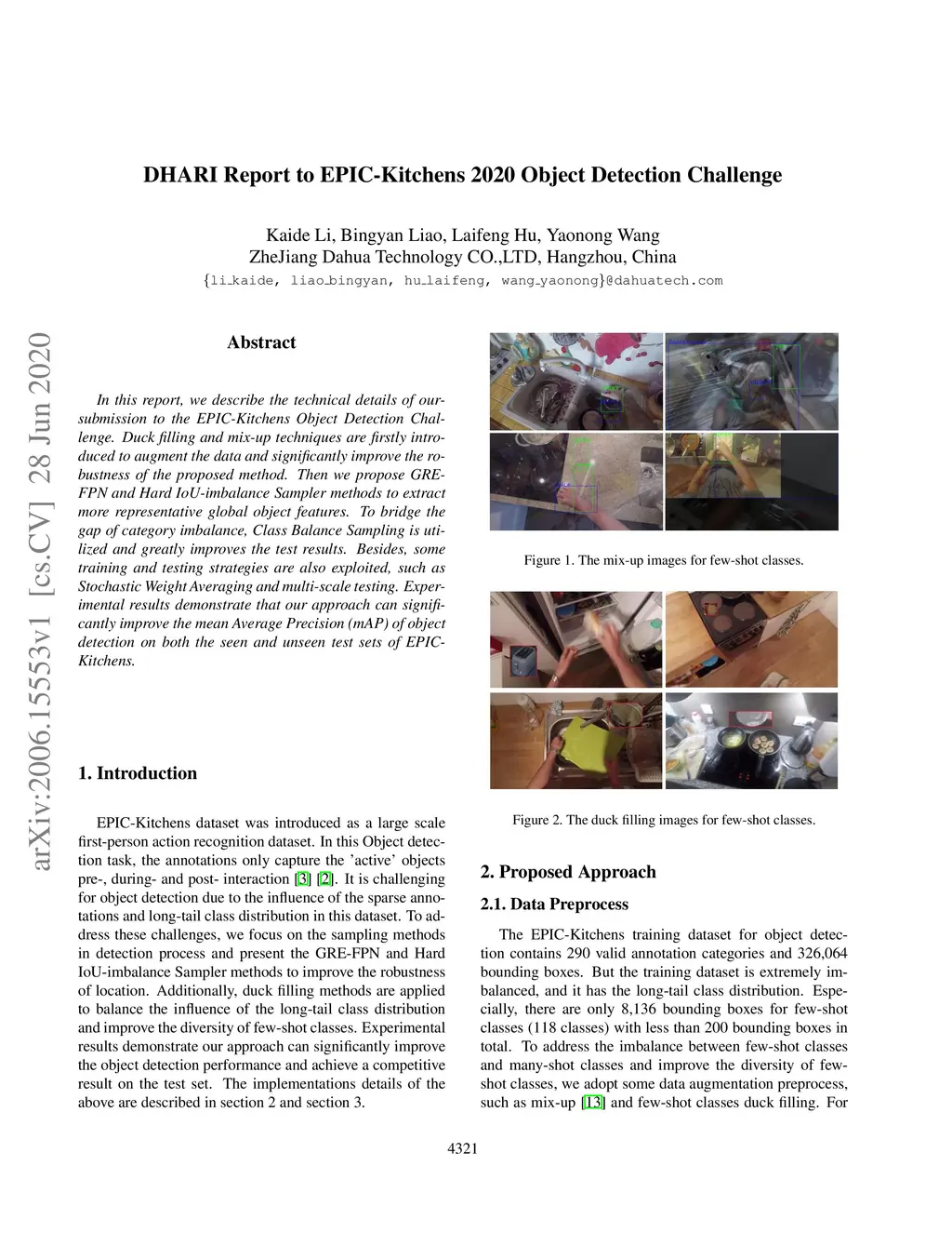 In this report, we describe the technical details of oursubmission to the EPIC-Kitchens Object Detection Challenge.Duck filling and mix-up techniques are firstly introduced to augment the data and significantly improve the robustness of the proposed method. Then we propose GRE-FPN and Hard IoU-imbalance Sampler methods to extract more representative global object features. To bridge the gap of category imbalance, Class Balance Sampling is utilized and greatly improves the test results. Besides, some training and testing strategies are also exploited, such as Stochastic Weight Averaging and multi-scale testing. Experimental results demonstrate that our approach can significantly improve the mean Average Precision (mAP) of object detection on both the seen and unseen test sets of EPICKitchens.