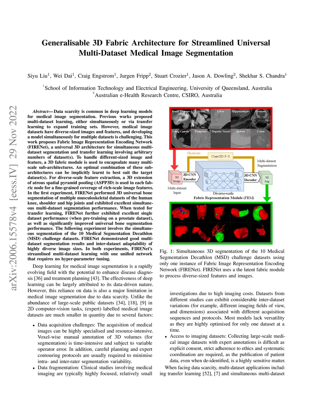 Data scarcity is common in deep learning models for medical image segmentation. Previous works proposed multi-dataset learning, either simultaneously or via transfer learning to expand training sets. However, medical image datasets have diverse-sized images and features, and developing a model simultaneously for multiple datasets is challenging. This work proposes Fabric Image Representation Encoding Network (FIRENet), a universal architecture for simultaneous multi-dataset segmentation and transfer learning involving arbitrary numbers of dataset(s). To handle different-sized image and feature, a 3D fabric module is used to encapsulate many multi-scale sub-architectures. An optimal combination of these sub-architectures can be implicitly learnt to best suit the target dataset(s). For diverse-scale feature extraction, a 3D extension of atrous spatial pyramid pooling (ASPP3D) is used in each fabric node for a fine-grained coverage of rich-scale image features. In the first experiment, FIRENet performed 3D universal bone segmentation of multiple musculoskeletal datasets of the human knee, shoulder and hip joints and exhibited excellent simultaneous multi-dataset segmentation performance. When tested for transfer learning, FIRENet further exhibited excellent single dataset performance (when pre-training on a prostate dataset), as well as significantly improved universal bone segmentation performance. The following experiment involves the simultaneous segmentation of the 10 Medical Segmentation Decathlon (MSD) challenge datasets. FIRENet demonstrated good multi-dataset segmentation results and inter-dataset adaptability of highly diverse image sizes. In both experiments, FIRENet's streamlined multi-dataset learning with one unified network that requires no hyper-parameter tuning.