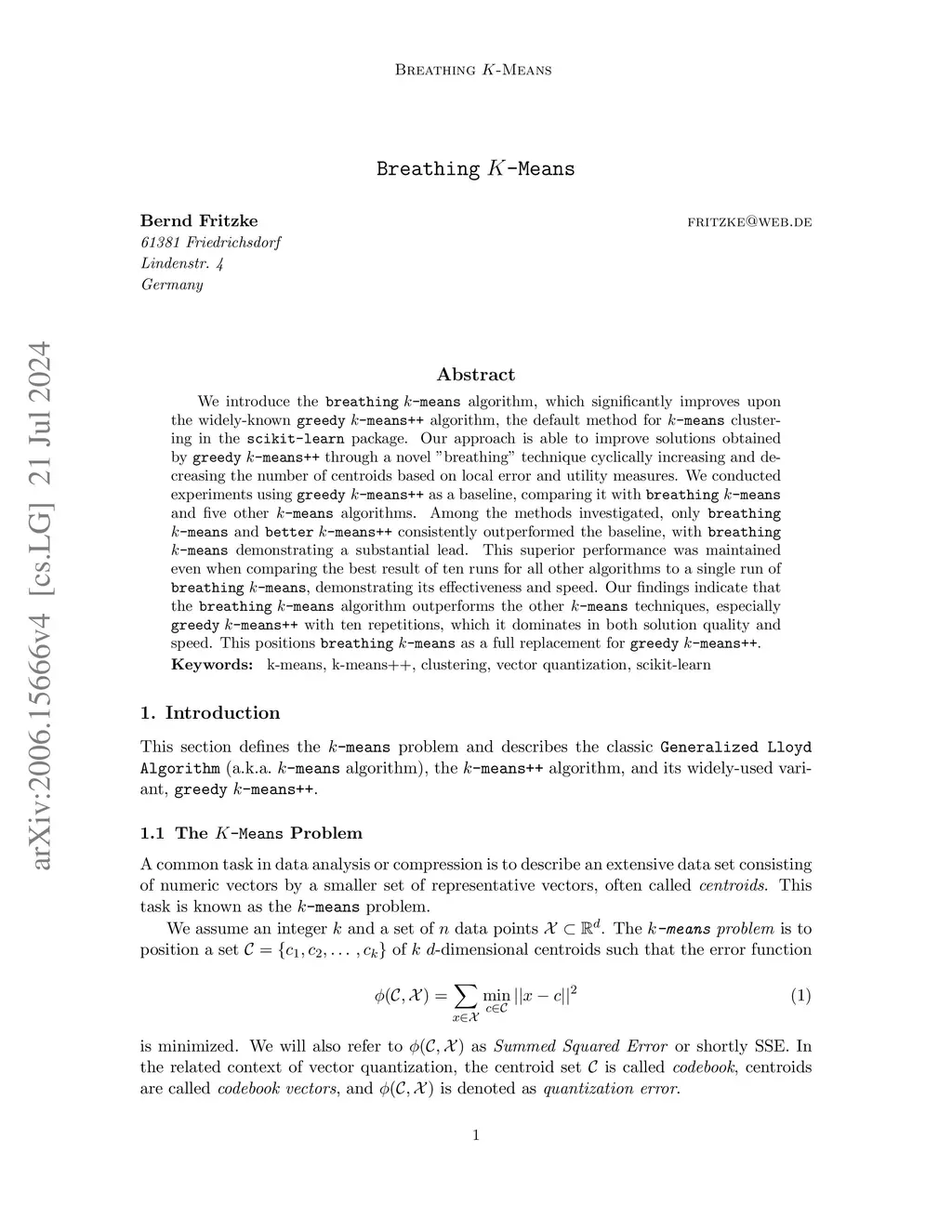 We propose "breathing -means", a novel approximation algorithm for the -means problem. After seeding the centroid set with the well-known -means++ algorithm, the new method cyclically increases and decreases the number of centroids in order to find an improved solution for the given problem. The -means++ solutions used for seeding are typically improved significantly while the extra computational cost is moderate. The effectiveness of our method is demonstrated on a variety of -means problems including all those used in the original -means++ publication. The Python implementation of the new algorithm consists of 78 lines of code.