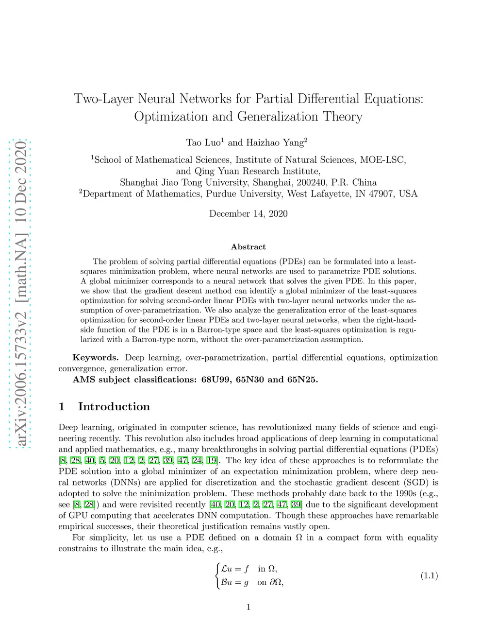 The problem of solving partial differential equations (PDEs) can be formulated into a least-squares minimization problem, where neural networks are used to parametrize PDE solutions. A global minimizer corresponds to a neural network that solves the given PDE. In this paper, we show that the gradient descent method can identify a global minimizer of the least-squares optimization for solving second-order linear PDEs with two-layer neural networks under the assumption of over-parametrization. We also analyze the generalization error of the least-squares optimization for second-order linear PDEs and two-layer neural networks, when the right-hand-side function of the PDE is in a Barron-type space and the least-squares optimization is regularized with a Barron-type norm, without the over-parametrization assumption.