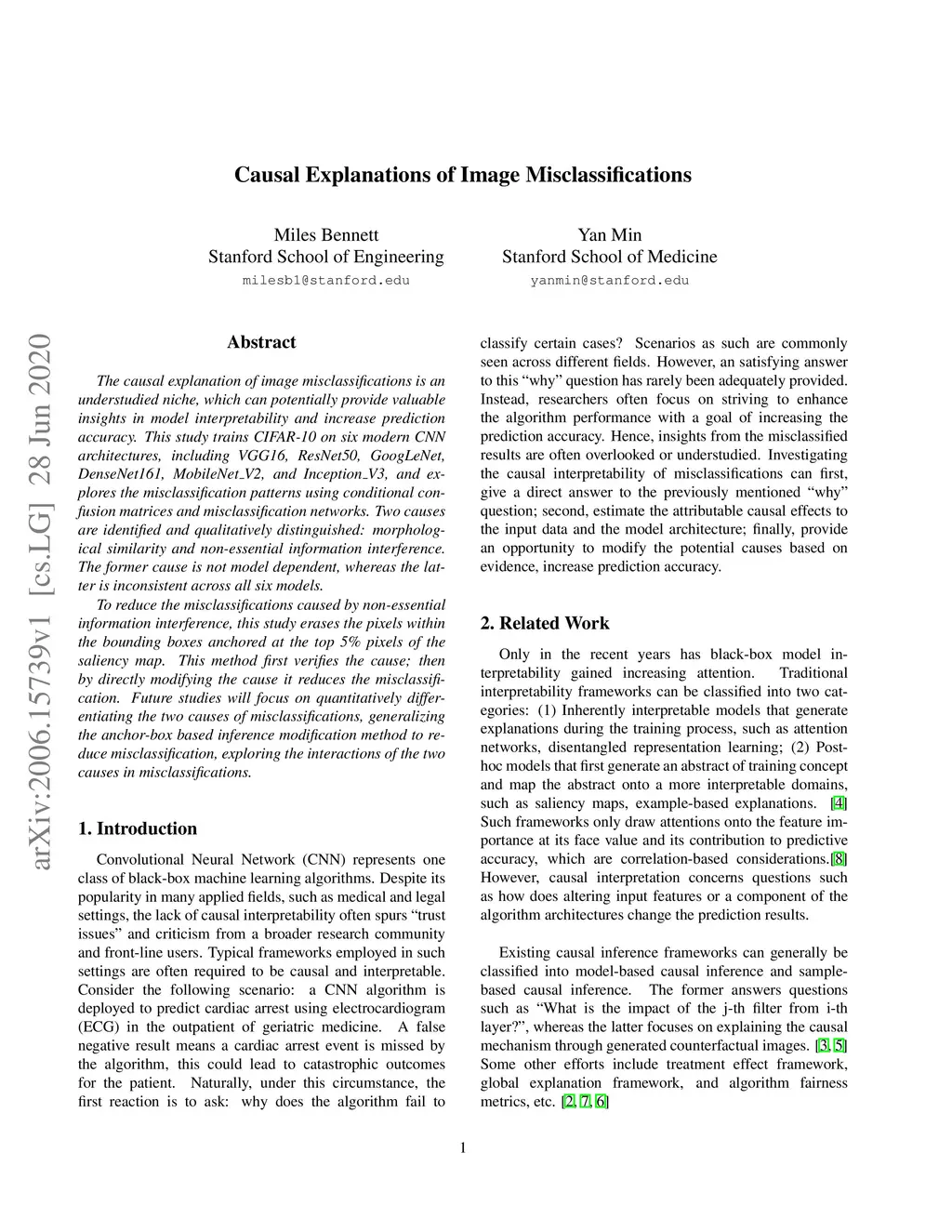 The causal explanation of image misclassifications is an understudied niche, which can potentially provide valuable insights in model interpretability and increase prediction accuracy. This study trains CIFAR-10 on six modern CNN architectures, including VGG16, ResNet50, GoogLeNet, DenseNet161, MobileNet V2, and Inception V3, and explores the misclassification patterns using conditional confusion matrices and misclassification networks. Two causes are identified and qualitatively distinguished: morphological similarity and non-essential information interference. The former cause is not model dependent, whereas the latter is inconsistent across all six models. To reduce the misclassifications caused by non-essential information interference, this study erases the pixels within the bonding boxes anchored at the top 5% pixels of the saliency map. This method first verifies the cause; then by directly modifying the cause it reduces the misclassification. Future studies will focus on quantitatively differentiating the two causes of misclassifications, generalizing the anchor-box based inference modification method to reduce misclassification, exploring the interactions of the two causes in misclassifications.
