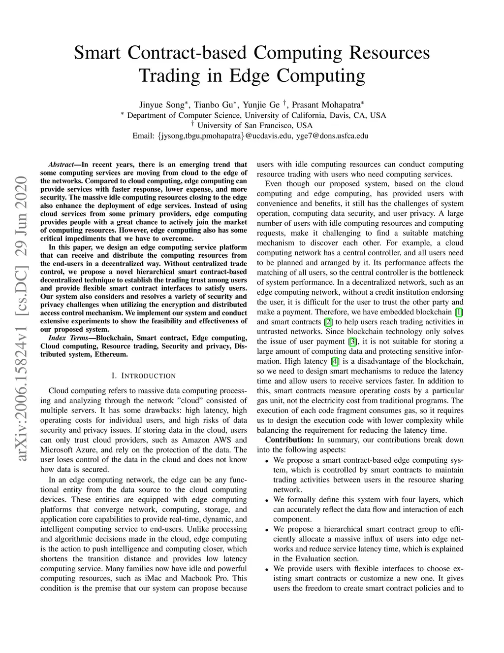 In recent years, there is an emerging trend that some computing services are moving from cloud to the edge of the networks. Compared to cloud computing, edge computing can provide services with faster response, lower expense, and more security. The massive idle computing resources closing to the edge also enhance the deployment of edge services. Instead of using cloud services from some primary providers, edge computing provides people with a great chance to actively join the market of computing resources. However, edge computing also has some critical impediments that we have to overcome. In this paper, we design an edge computing service platform that can receive and distribute the computing resources from the end-users in a decentralized way. Without centralized trade control, we propose a novel hierarchical smart contract-based decentralized technique to establish the trading trust among users and provide flexible smart contract interfaces to satisfy users. Our system also considers and resolves a variety of security and privacy challenges when utilizing the encryption and distributed access control mechanism. We implement our system and conduct extensive experiments to show the feasibility and effectiveness of our proposed system.