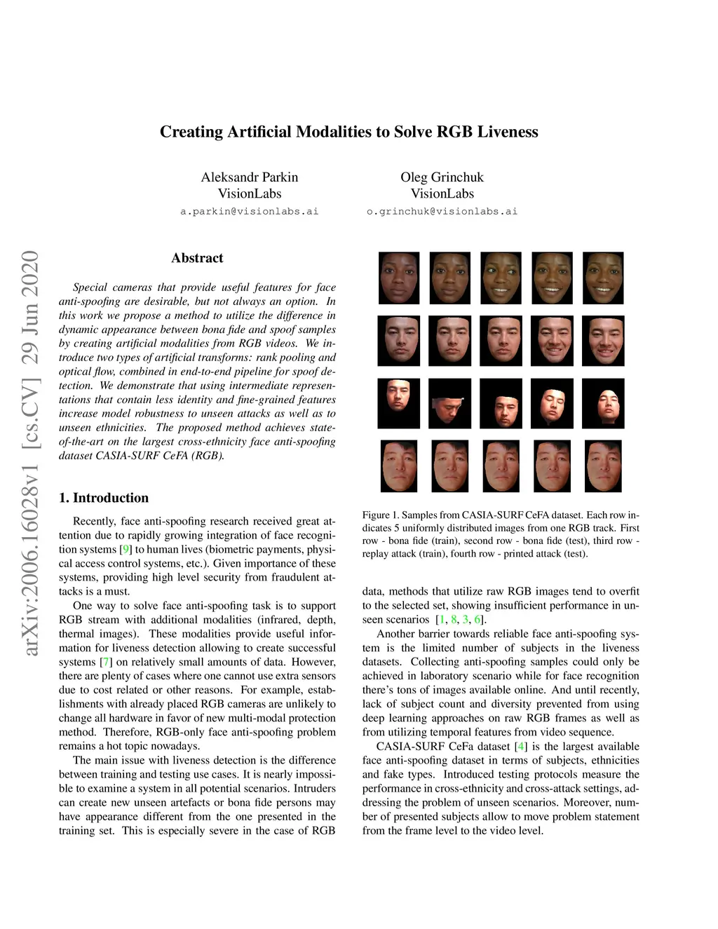 Special cameras that provide useful features for face anti-spoofing are desirable, but not always an option. In this work we propose a method to utilize the difference in dynamic appearance between bona fide and spoof samples by creating artificial modalities from RGB videos. We introduce two types of artificial transforms: rank pooling and optical flow, combined in end-to-end pipeline for spoof detection. We demonstrate that using intermediate representations that contain less identity and fine-grained features increase model robustness to unseen attacks as well as to unseen ethnicities. The proposed method achieves state-of-the-art on the largest cross-ethnicity face anti-spoofing dataset CASIA-SURF CeFA (RGB).