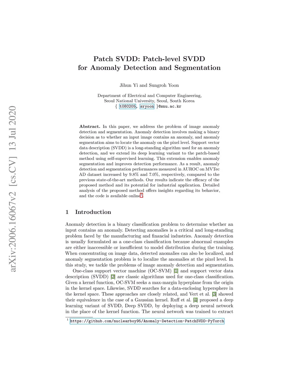 Patch SVDD: Patch-level SVDD for Anomaly Detection and Segmentation