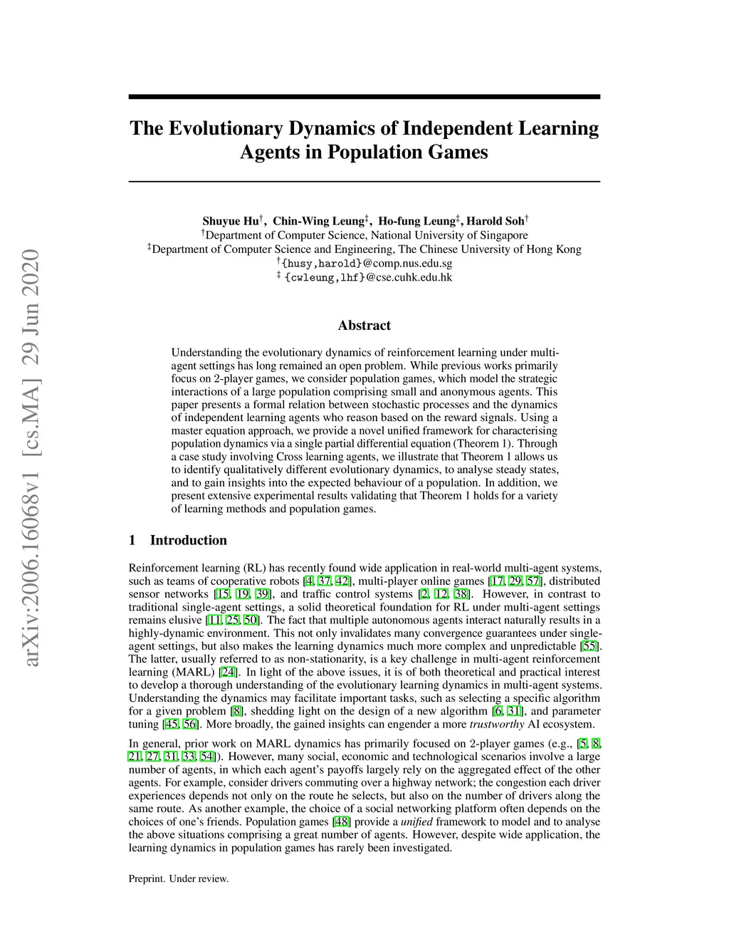 The Evolutionary Dynamics of Independent Learning Agents in Population