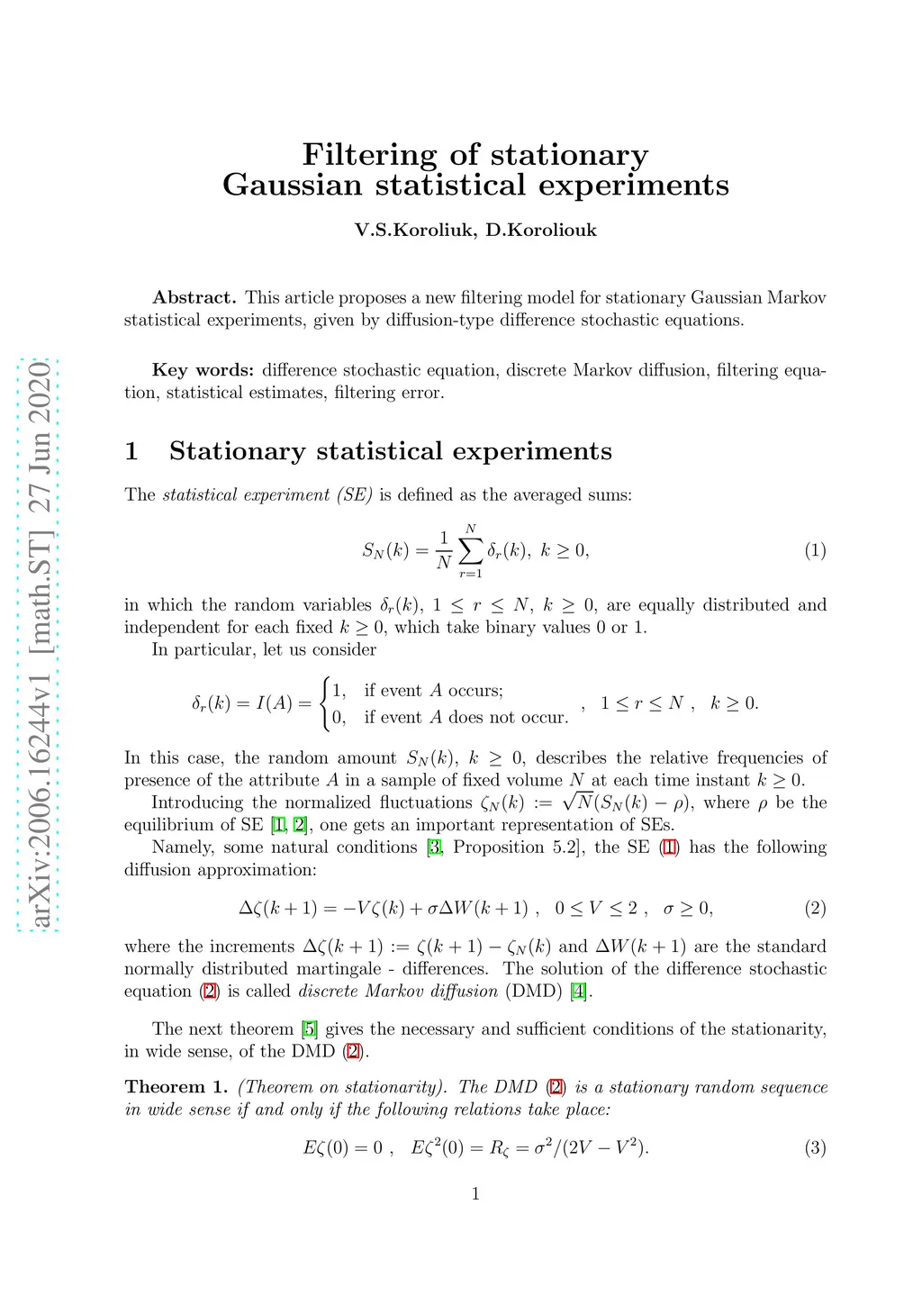 This article proposes a new filtering model for stationary Gaussian Markov statistical experiments, given by diffusion-type difference stochastic equations.