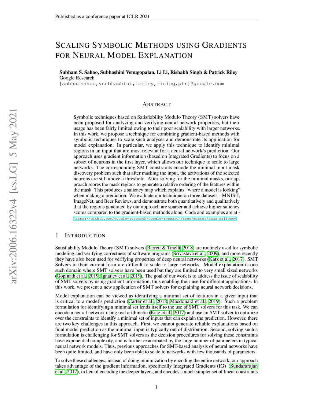 Symbolic techniques based on Satisfiability Modulo Theory (SMT) solvers have been proposed for analyzing and verifying neural network properties, but their usage has been fairly limited owing to their poor scalability with larger networks. In this work, we propose a technique for combining gradient-based methods with symbolic techniques to scale such analyses and demonstrate its application for model explanation. In particular, we apply this technique to identify minimal regions in an input that are most relevant for a neural network's prediction. Our approach uses gradient information (based on Integrated Gradients) to focus on a subset of neurons in the first layer, which allows our technique to scale to large networks. The corresponding SMT constraints encode the minimal input mask discovery problem such that after masking the input, the activations of the selected neurons are still above a threshold. After solving for the minimal masks, our approach scores the mask regions to generate a relative ordering of the features within the mask. This produces a saliency map which explains "where a model is looking" when making a prediction. We evaluate our technique on three datasets - MNIST, ImageNet, and Beer Reviews, and demonstrate both quantitatively and qualitatively that the regions generated by our approach are sparser and achieve higher saliency scores compared to the gradient-based methods alone. Code and examples are at - https://github.com/google-research/google-research/tree/master/smug_saliency