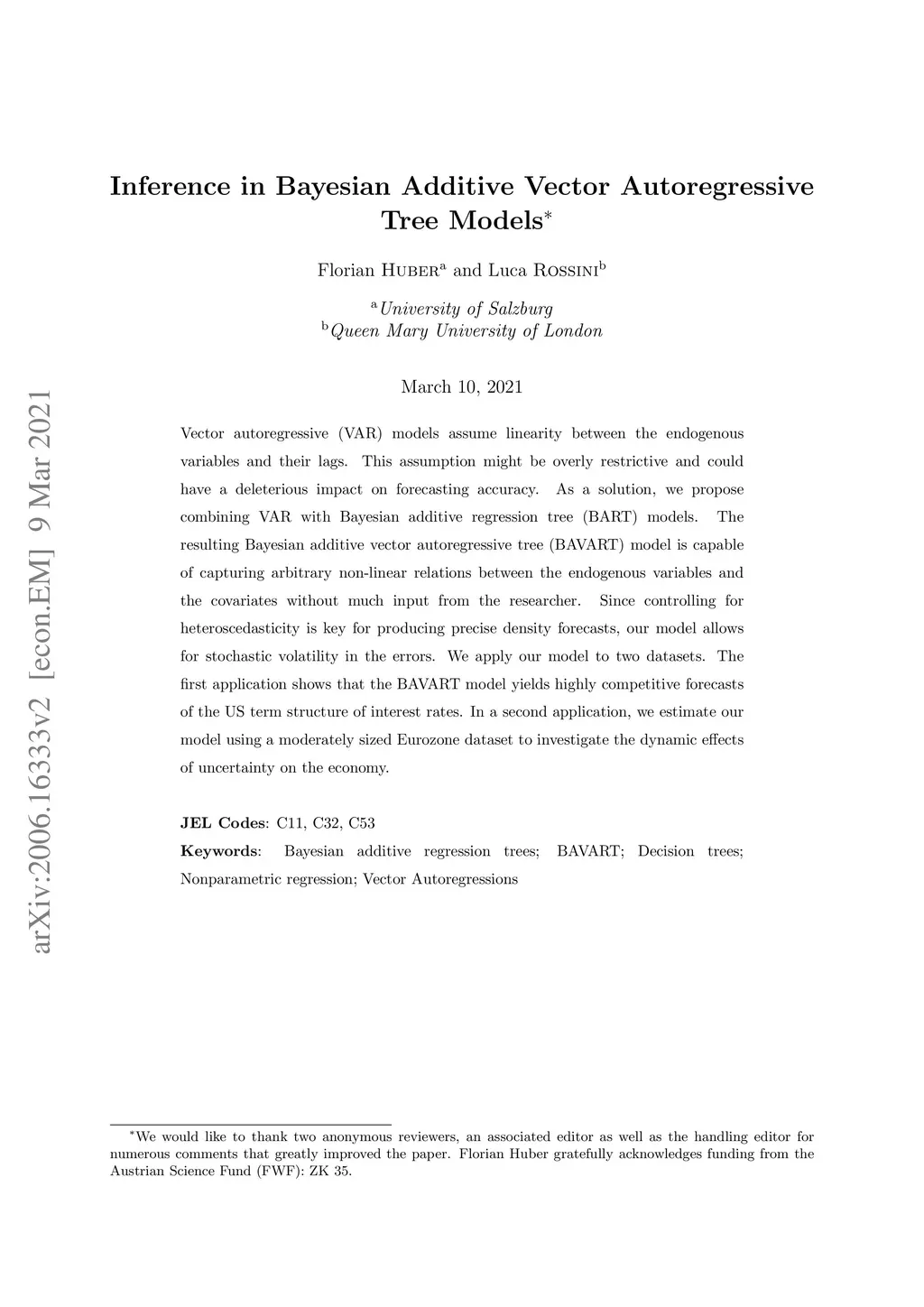 Vector autoregressive (VAR) models assume linearity between the endogenous variables and their lags. This assumption might be overly restrictive and could have a deleterious impact on forecasting accuracy. As a solution, we propose combining VAR with Bayesian additive regression tree (BART) models. The resulting Bayesian additive vector autoregressive tree (BAVART) model is capable of capturing arbitrary non-linear relations between the endogenous variables and the covariates without much input from the researcher. Since controlling for heteroscedasticity is key for producing precise density forecasts, our model allows for stochastic volatility in the errors. We apply our model to two datasets. The first application shows that the BAVART model yields highly competitive forecasts of the US term structure of interest rates. In a second application, we estimate our model using a moderately sized Eurozone dataset to investigate the dynamic effects of uncertainty on the economy.