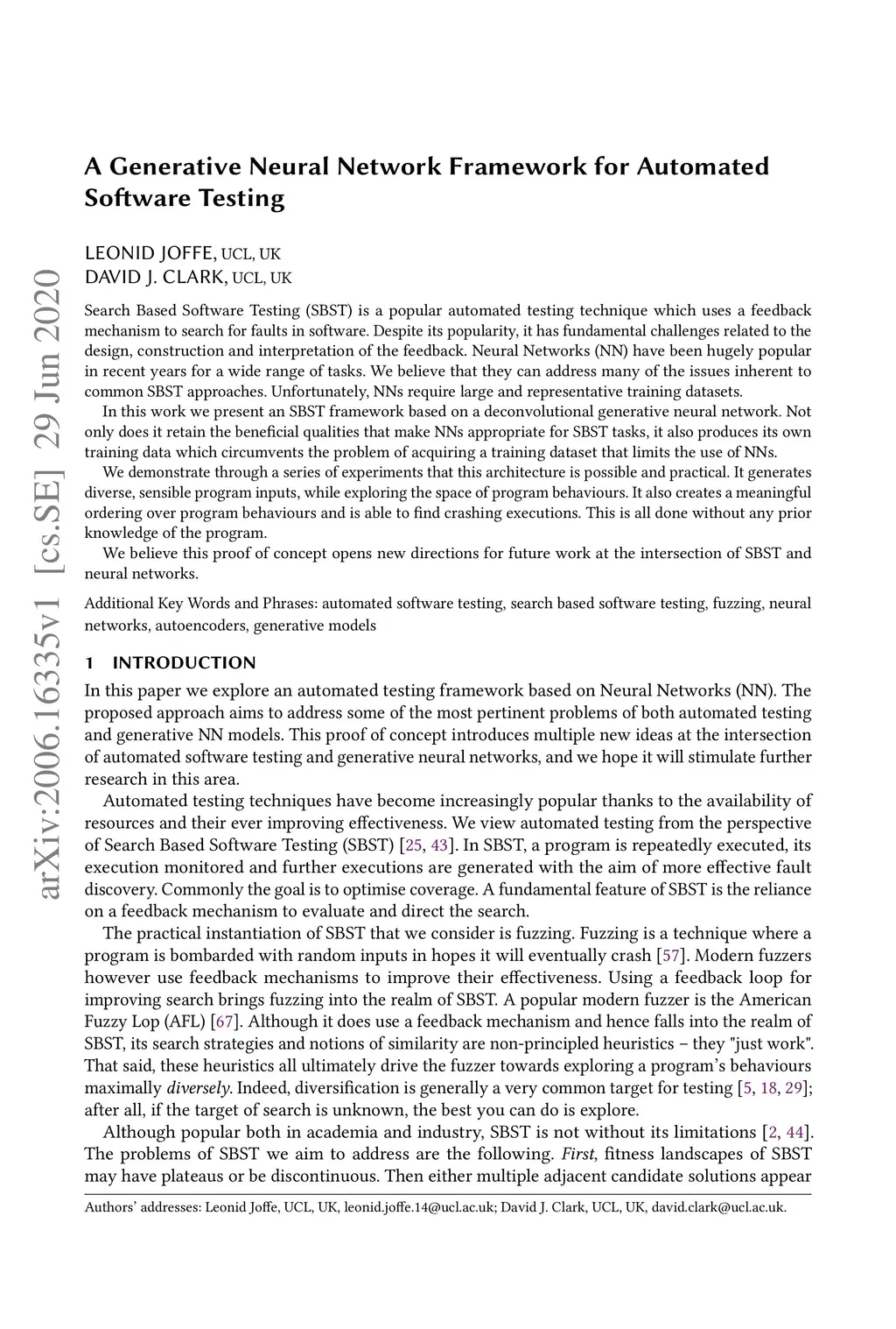 A Generative Neural Network Framework for Automated Software Testing