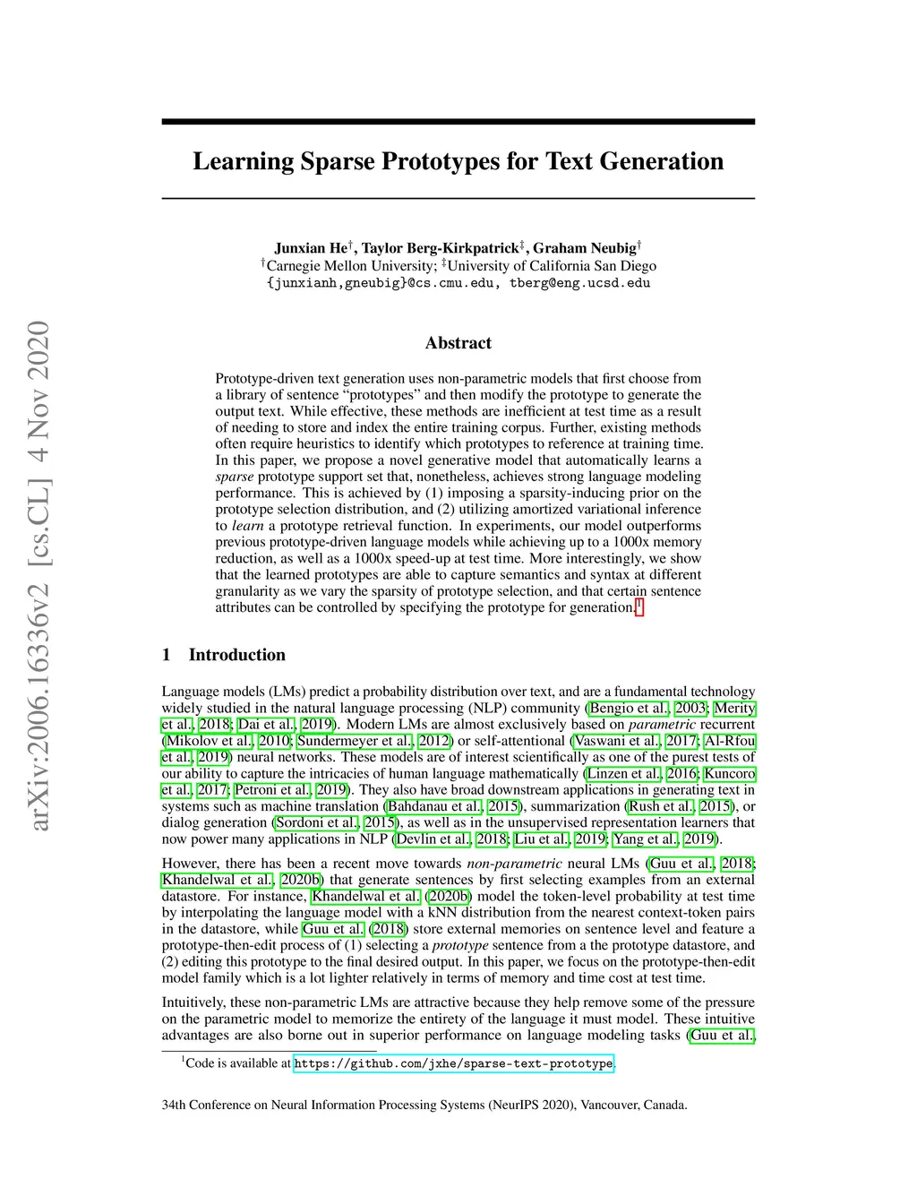 Learning Sparse Prototypes for Text Generation