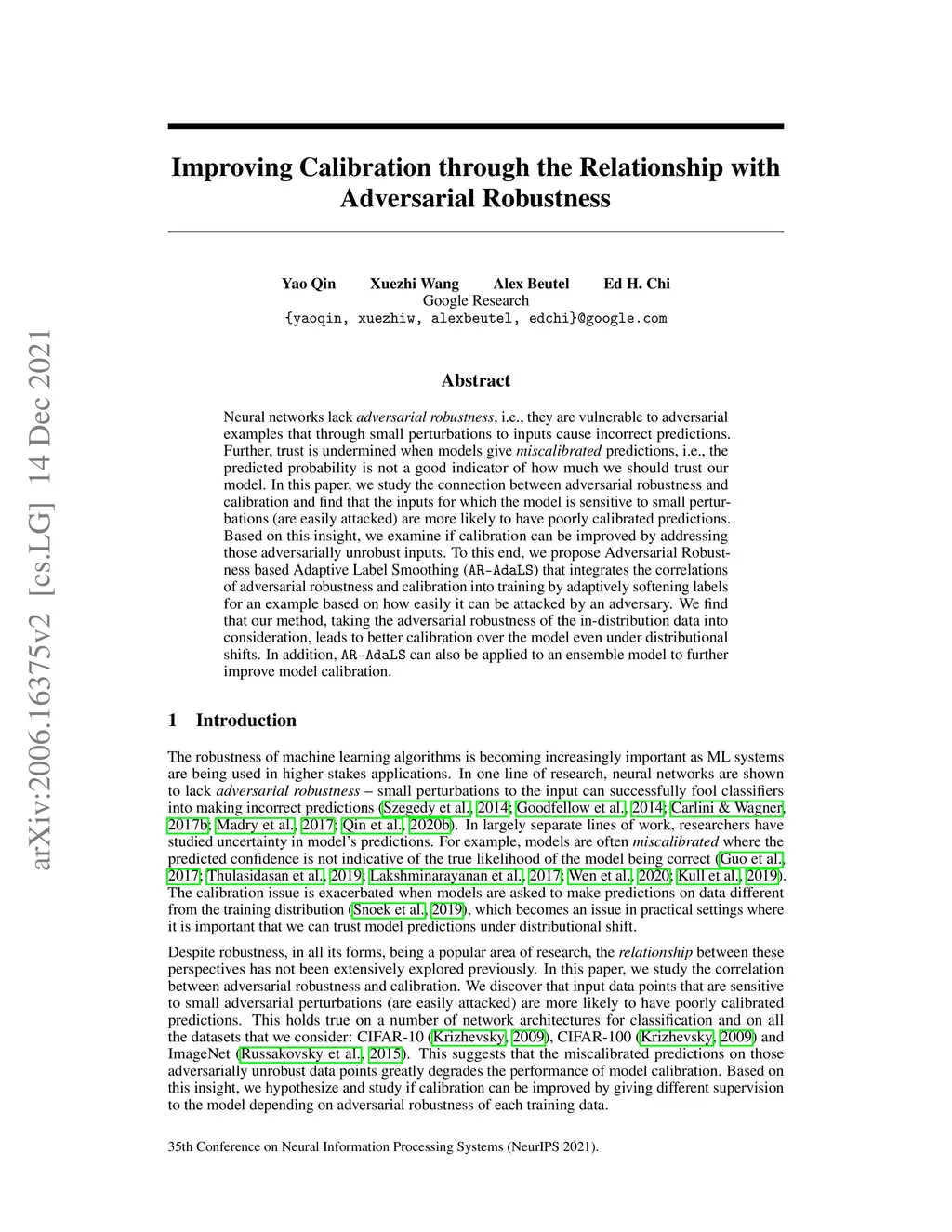 Neural networks lack adversarial robustness, i.e., they are vulnerable to adversarial examples that through small perturbations to inputs cause incorrect predictions. Further, trust is undermined when models give miscalibrated predictions, i.e., the predicted probability is not a good indicator of how much we should trust our model. In this paper, we study the connection between adversarial robustness and calibration and find that the inputs for which the model is sensitive to small perturbations (are easily attacked) are more likely to have poorly calibrated predictions. Based on this insight, we examine if calibration can be improved by addressing those adversarially unrobust inputs. To this end, we propose Adversarial Robustness based Adaptive Label Smoothing (AR-AdaLS) that integrates the correlations of adversarial robustness and calibration into training by adaptively softening labels for an example based on how easily it can be attacked by an adversary. We find that our method, taking the adversarial robustness of the in-distribution data into consideration, leads to better calibration over the model even under distributional shifts. In addition, AR-AdaLS can also be applied to an ensemble model to further improve model calibration.