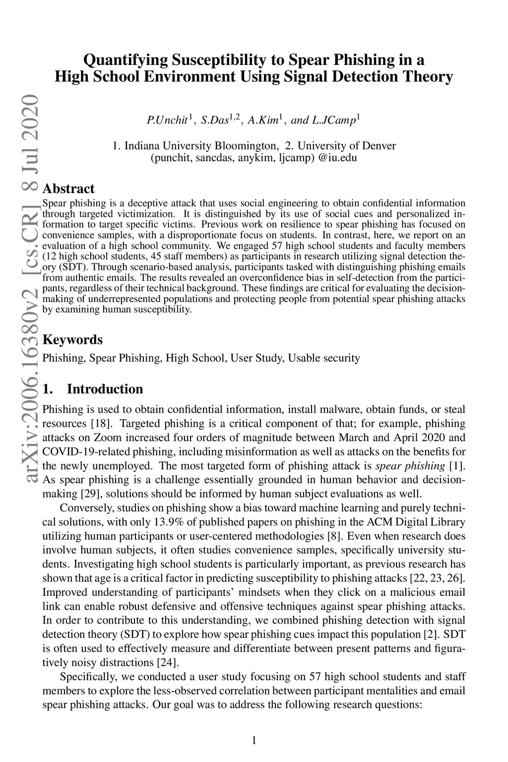 Spear phishing is a deceptive attack that uses social engineering to obtain confidential information through targeted victimization. It is distinguished by its use of social cues and personalized information to target specific victims. Previous work on resilience to spear phishing has focused on convenience samples, with a disproportionate focus on students. In contrast, here, we report on an evaluation of a high school community. We engaged 57 high school students and faculty members (12 high school students, 45 staff members) as participants in research utilizing signal detection theory (SDT). Through scenario-based analysis, participants tasked with distinguishing phishing emails from authentic emails. The results revealed an overconfidence bias in self-detection from the participants, regardless of their technical background. These findings are critical for evaluating the decision-making of underrepresented populations and protecting people from potential spear phishing attacks by examining human susceptibility.
