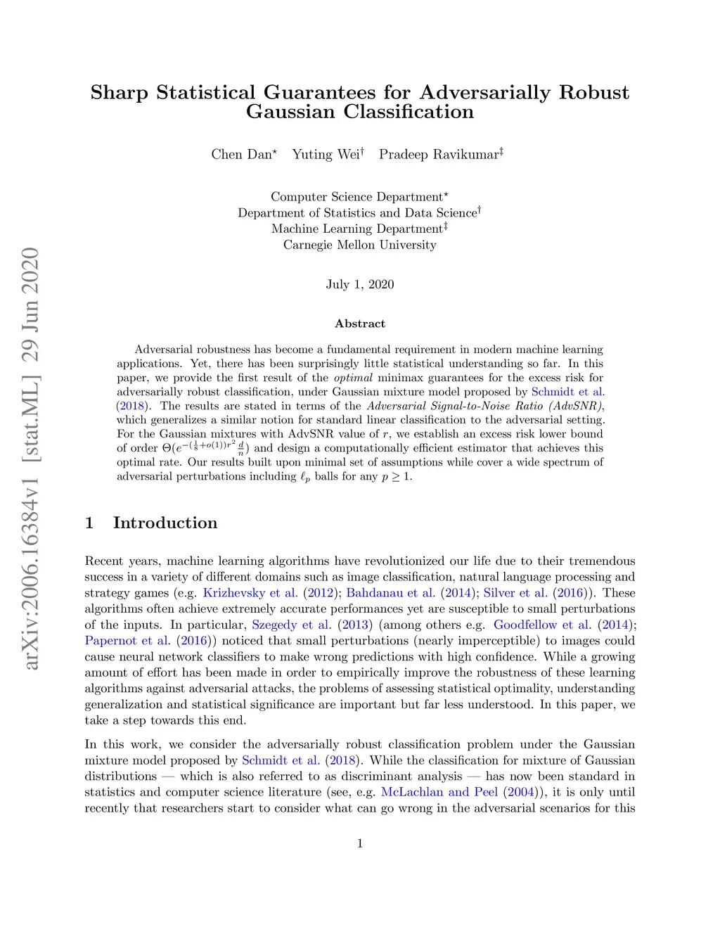 Adversarial robustness has become a fundamental requirement in modern machine learning applications. Yet, there has been surprisingly little statistical understanding so far. In this paper, we provide the first result of the optimal minimax guarantees for the excess risk for adversarially robust classification, under Gaussian mixture model proposed by \cite{schmidt2018adversarially}. The results are stated in terms of the Adversarial Signal-to-Noise Ratio (AdvSNR), which generalizes a similar notion for standard linear classification to the adversarial setting. For the Gaussian mixtures with AdvSNR value of , we establish an excess risk lower bound of order and design a computationally efficient estimator that achieves this optimal rate. Our results built upon minimal set of assumptions while cover a wide spectrum of adversarial perturbations including balls for any .