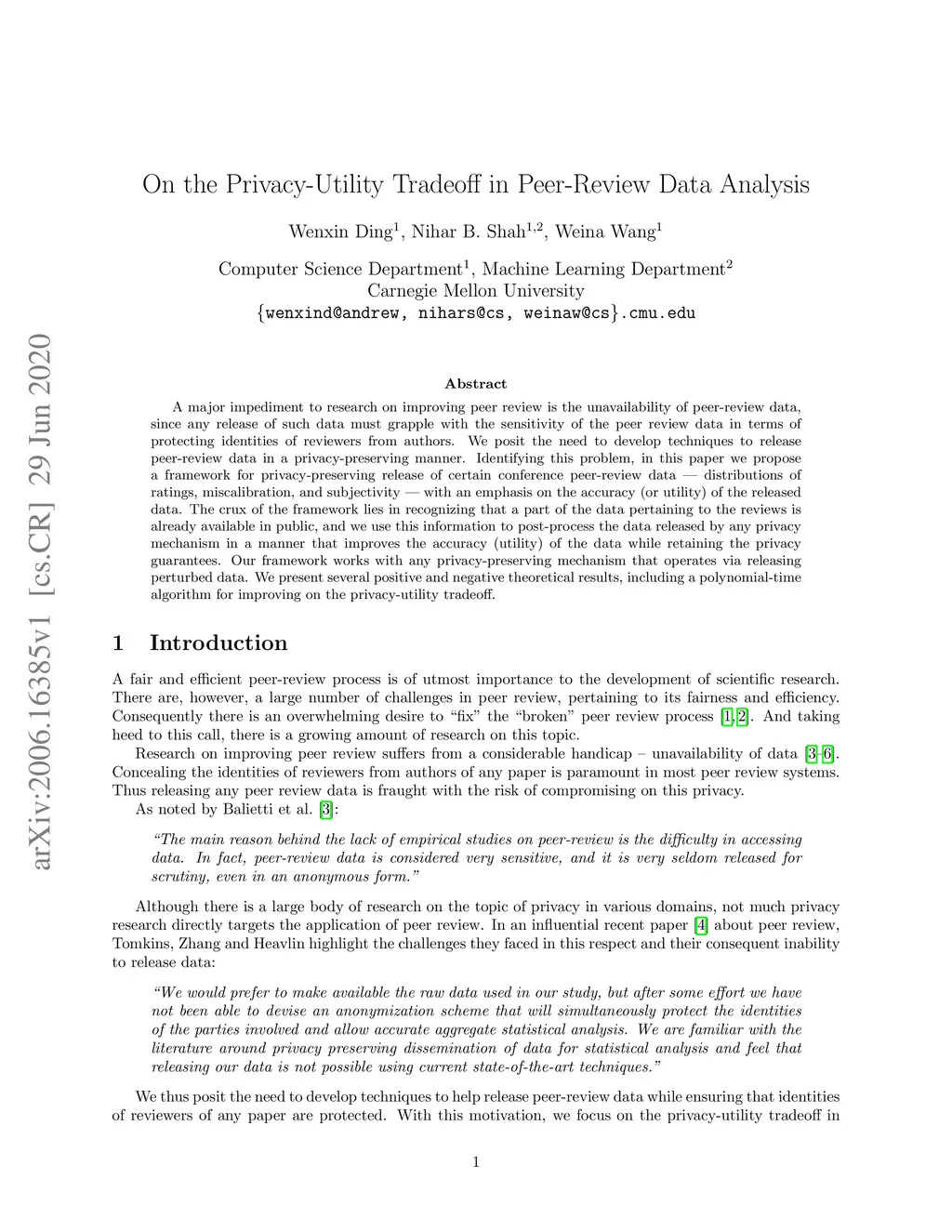 On the Privacy-Utility Tradeoff in Peer-Review Data Analysis