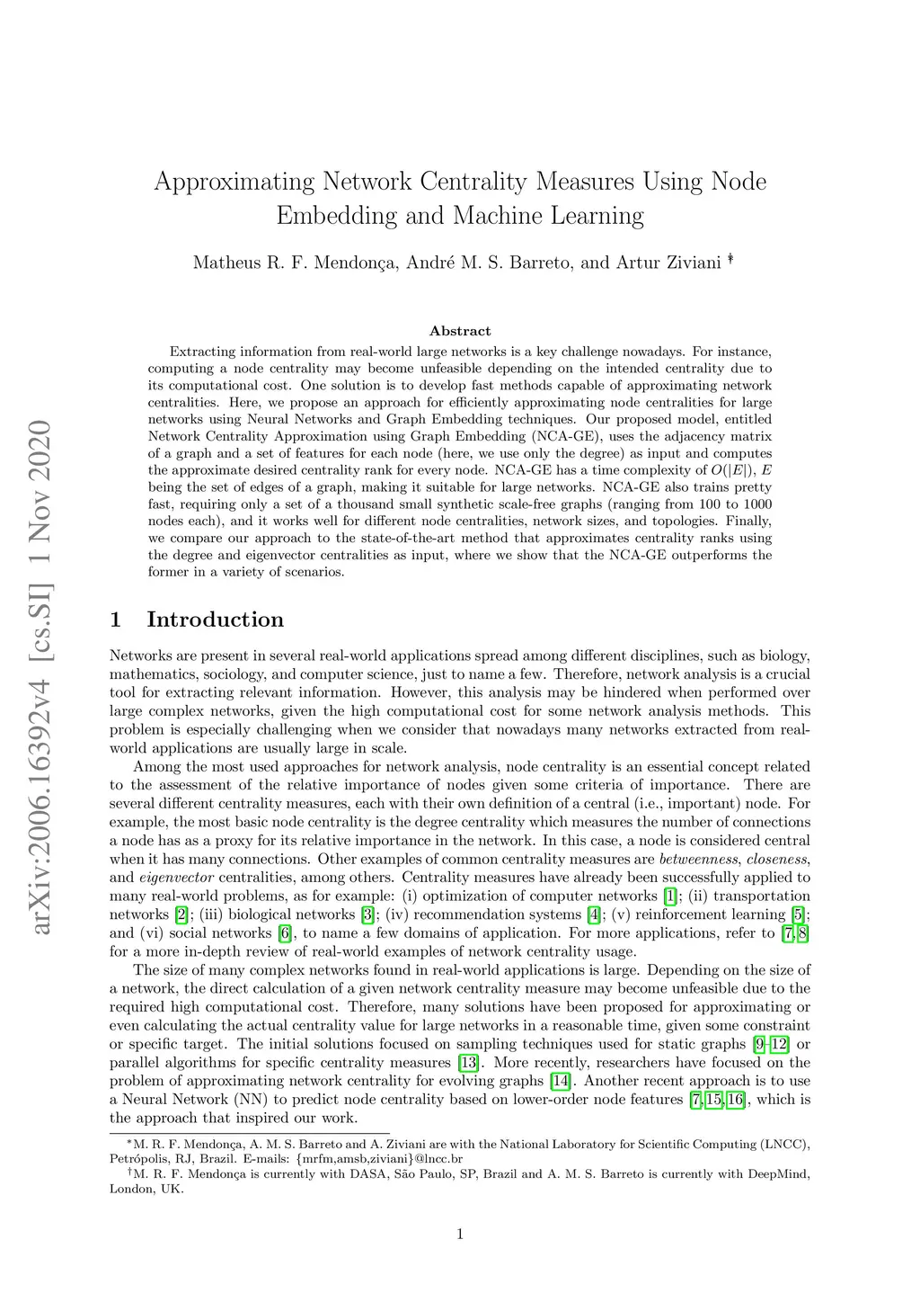 Extracting information from real-world large networks is a key challenge nowadays. For instance, computing a node centrality may become unfeasible depending on the intended centrality due to its computational cost. One solution is to develop fast methods capable of approximating network centralities. Here, we propose an approach for efficiently approximating node centralities for large networks using Neural Networks and Graph Embedding techniques. Our proposed model, entitled Network Centrality Approximation using Graph Embedding (NCA-GE), uses the adjacency matrix of a graph and a set of features for each node (here, we use only the degree) as input and computes the approximate desired centrality rank for every node. NCA-GE has a time complexity of , being the set of edges of a graph, making it suitable for large networks. NCA-GE also trains pretty fast, requiring only a set of a thousand small synthetic scale-free graphs (ranging from 100 to 1000 nodes each), and it works well for different node centralities, network sizes, and topologies. Finally, we compare our approach to the state-of-the-art method that approximates centrality ranks using the degree and eigenvector centralities as input, where we show that the NCA-GE outperforms the former in a variety of scenarios.