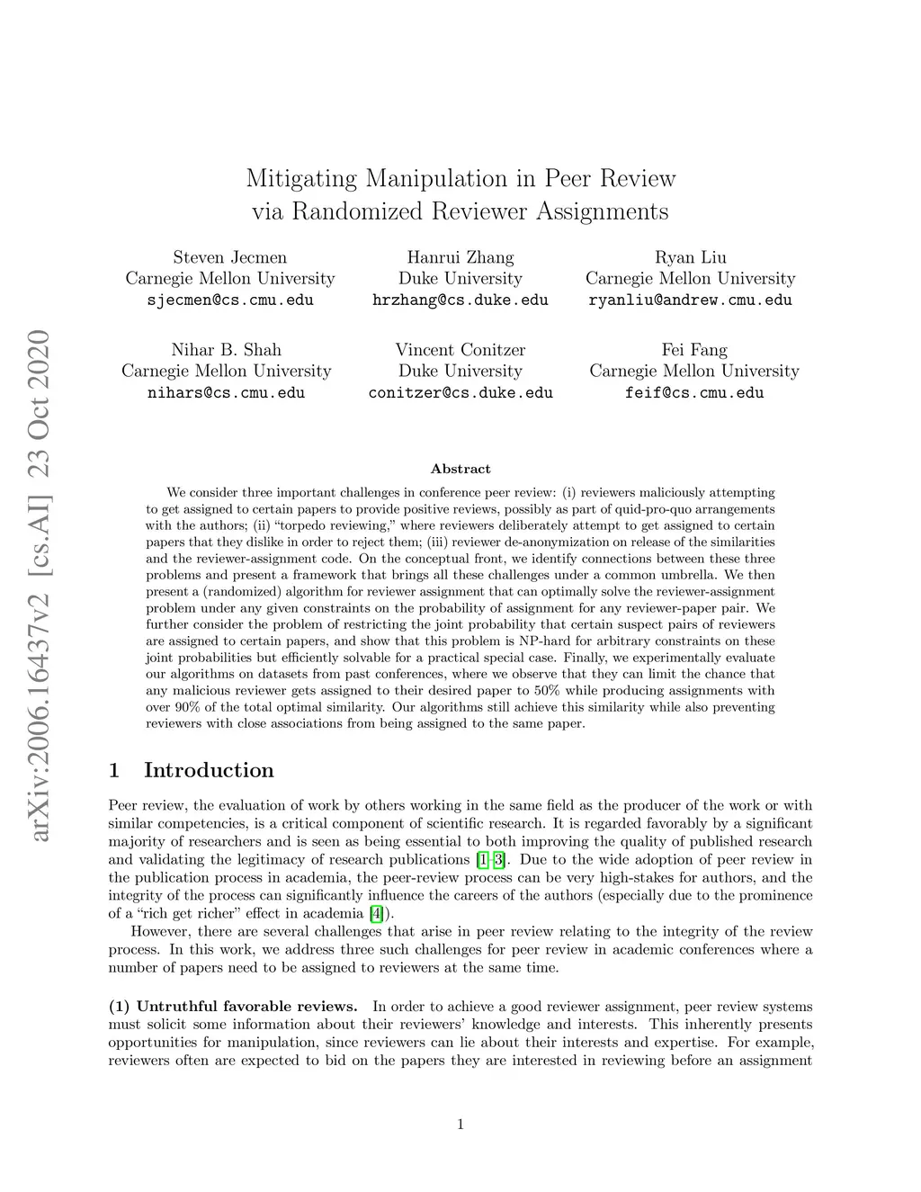 We consider three important challenges in conference peer review: (i) reviewers maliciously attempting to get assigned to certain papers to provide positive reviews, possibly as part of quid-pro-quo arrangements with the authors; (ii) "torpedo reviewing," where reviewers deliberately attempt to get assigned to certain papers that they dislike in order to reject them; (iii) reviewer de-anonymization on release of the similarities and the reviewer-assignment code. On the conceptual front, we identify connections between these three problems and present a framework that brings all these challenges under a common umbrella. We then present a (randomized) algorithm for reviewer assignment that can optimally solve the reviewer-assignment problem under any given constraints on the probability of assignment for any reviewer-paper pair. We further consider the problem of restricting the joint probability that certain suspect pairs of reviewers are assigned to certain papers, and show that this problem is NP-hard for arbitrary constraints on these joint probabilities but efficiently solvable for a practical special case. Finally, we experimentally evaluate our algorithms on datasets from past conferences, where we observe that they can limit the chance that any malicious reviewer gets assigned to their desired paper to 50% while producing assignments with over 90% of the total optimal similarity. Our algorithms still achieve this similarity while also preventing reviewers with close associations from being assigned to the same paper.