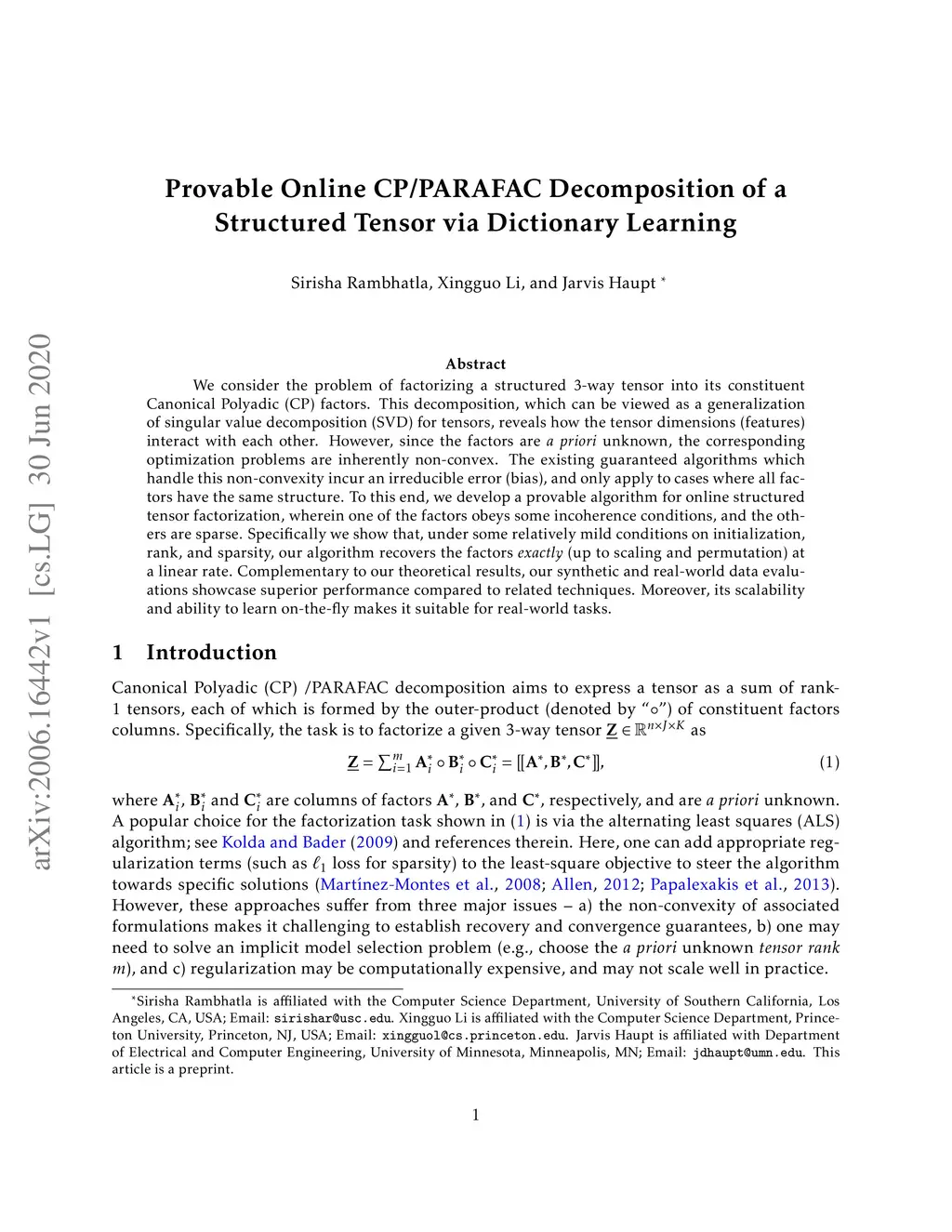We consider the problem of factorizing a structured 3-way tensor into its constituent Canonical Polyadic (CP) factors. This decomposition, which can be viewed as a generalization of singular value decomposition (SVD) for tensors, reveals how the tensor dimensions (features) interact with each other. However, since the factors are a priori unknown, the corresponding optimization problems are inherently non-convex. The existing guaranteed algorithms which handle this non-convexity incur an irreducible error (bias), and only apply to cases where all factors have the same structure. To this end, we develop a provable algorithm for online structured tensor factorization, wherein one of the factors obeys some incoherence conditions, and the others are sparse. Specifically we show that, under some relatively mild conditions on initialization, rank, and sparsity, our algorithm recovers the factors exactly (up to scaling and permutation) at a linear rate. Complementary to our theoretical results, our synthetic and real-world data evaluations showcase superior performance compared to related techniques. Moreover, its scalability and ability to learn on-the-fly makes it suitable for real-world tasks.