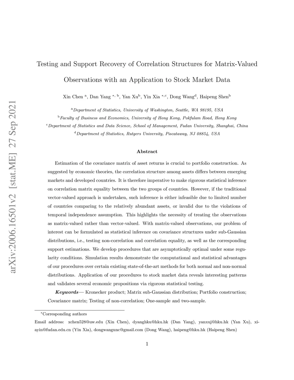 Estimation of the covariance matrix of asset returns is crucial to portfolio construction. As suggested by economic theories, the correlation structure among assets differs between emerging markets and developed countries. It is therefore imperative to make rigorous statistical inference on correlation matrix equality between the two groups of countries. However, if the traditional vector-valued approach is undertaken, such inference is either infeasible due to limited number of countries comparing to the relatively abundant assets, or invalid due to the violations of temporal independence assumption. This highlights the necessity of treating the observations as matrix-valued rather than vector-valued. With matrix-valued observations, our problem of interest can be formulated as statistical inference on covariance structures under sub-Gaussian distributions, i.e., testing non-correlation and correlation equality, as well as the corresponding support estimations. We develop procedures that are asymptotically optimal under some regularity conditions. Simulation results demonstrate the computational and statistical advantages of our procedures over certain existing state-of-the-art methods for both normal and non-normal distributions. Application of our procedures to stock market data reveals interesting patterns and validates several economic propositions via rigorous statistical testing.