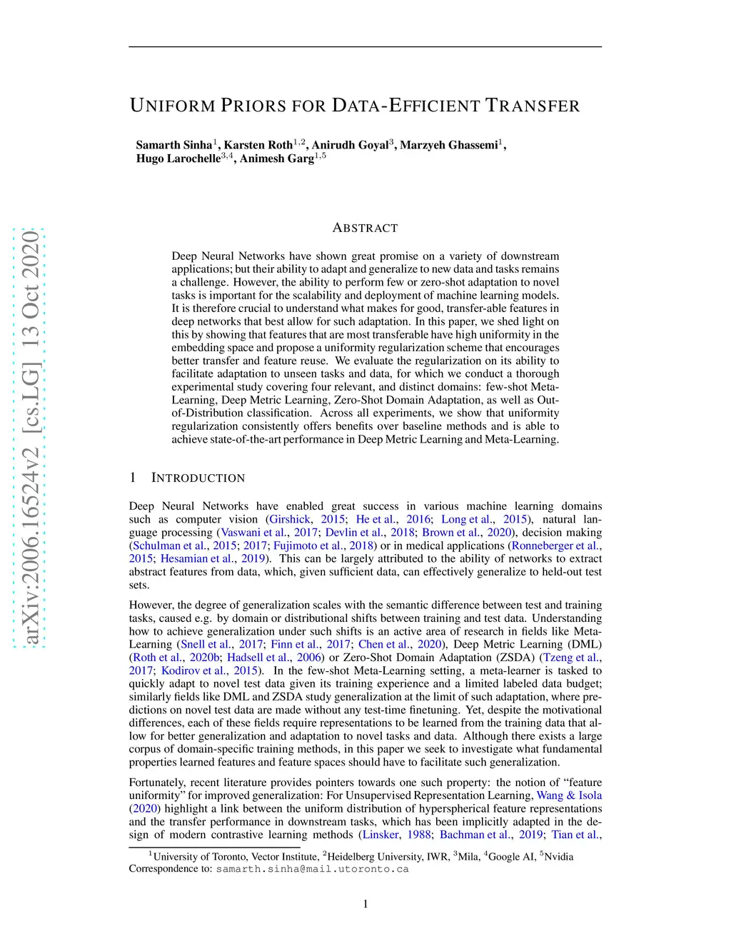 Deep Neural Networks have shown great promise on a variety of downstream applications; but their ability to adapt and generalize to new data and tasks remains a challenge. However, the ability to perform few or zero-shot adaptation to novel tasks is important for the scalability and deployment of machine learning models. It is therefore crucial to understand what makes for good, transfer-able features in deep networks that best allow for such adaptation. In this paper, we shed light on this by showing that features that are most transferable have high uniformity in the embedding space and propose a uniformity regularization scheme that encourages better transfer and feature reuse. We evaluate the regularization on its ability to facilitate adaptation to unseen tasks and data, for which we conduct a thorough experimental study covering four relevant, and distinct domains: few-shot Meta-Learning, Deep Metric Learning, Zero-Shot Domain Adaptation, as well as Out-of-Distribution classification. Across all experiments, we show that uniformity regularization consistently offers benefits over baseline methods and is able to achieve state-of-the-art performance in Deep Metric Learning and Meta-Learning.