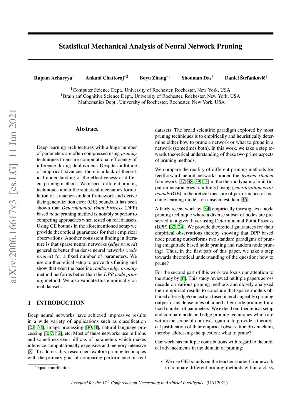 Deep learning architectures with a huge number of parameters are often compressed using pruning techniques to ensure computational efficiency of inference during deployment. Despite multitude of empirical advances, there is a lack of theoretical understanding of the effectiveness of different pruning methods. We inspect different pruning techniques under the statistical mechanics formulation of a teacher-student framework and derive their generalization error (GE) bounds. It has been shown that Determinantal Point Process (DPP) based node pruning method is notably superior to competing approaches when tested on real datasets. Using GE bounds in the aforementioned setup we provide theoretical guarantees for their empirical observations. Another consistent finding in literature is that sparse neural networks (edge pruned) generalize better than dense neural networks (node pruned) for a fixed number of parameters. We use our theoretical setup to prove this finding and show that even the baseline random edge pruning method performs better than the DPP node pruning method. We also validate this empirically on real datasets.