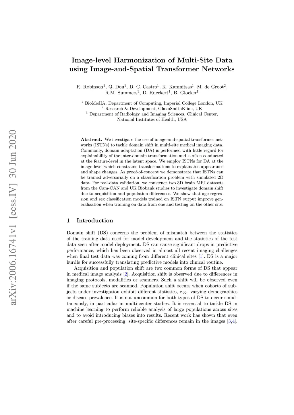 We investigate the use of image-and-spatial transformer networks (ISTNs) to tackle domain shift in multi-site medical imaging data. Commonly, domain adaptation (DA) is performed with little regard for explainability of the inter-domain transformation and is often conducted at the feature-level in the latent space. We employ ISTNs for DA at the image-level which constrains transformations to explainable appearance and shape changes. As proof-of-concept we demonstrate that ISTNs can be trained adversarially on a classification problem with simulated 2D data. For real-data validation, we construct two 3D brain MRI datasets from the Cam-CAN and UK Biobank studies to investigate domain shift due to acquisition and population differences. We show that age regression and sex classification models trained on ISTN output improve generalization when training on data from one and testing on the other site.