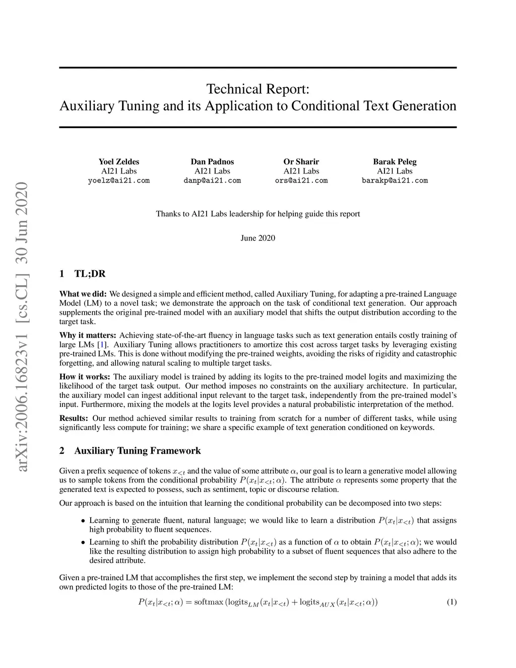 We introduce a simple and efficient method, called Auxiliary Tuning, for adapting a pre-trained Language Model to a novel task; we demonstrate this approach on the task of conditional text generation. Our approach supplements the original pre-trained model with an auxiliary model that shifts the output distribution according to the target task. The auxiliary model is trained by adding its logits to the pre-trained model logits and maximizing the likelihood of the target task output. Our method imposes no constraints on the auxiliary architecture. In particular, the auxiliary model can ingest additional input relevant to the target task, independently from the pre-trained model's input. Furthermore, mixing the models at the logits level provides a natural probabilistic interpretation of the method. Our method achieved similar results to training from scratch for several different tasks, while using significantly fewer resources for training; we share a specific example of text generation conditioned on keywords.