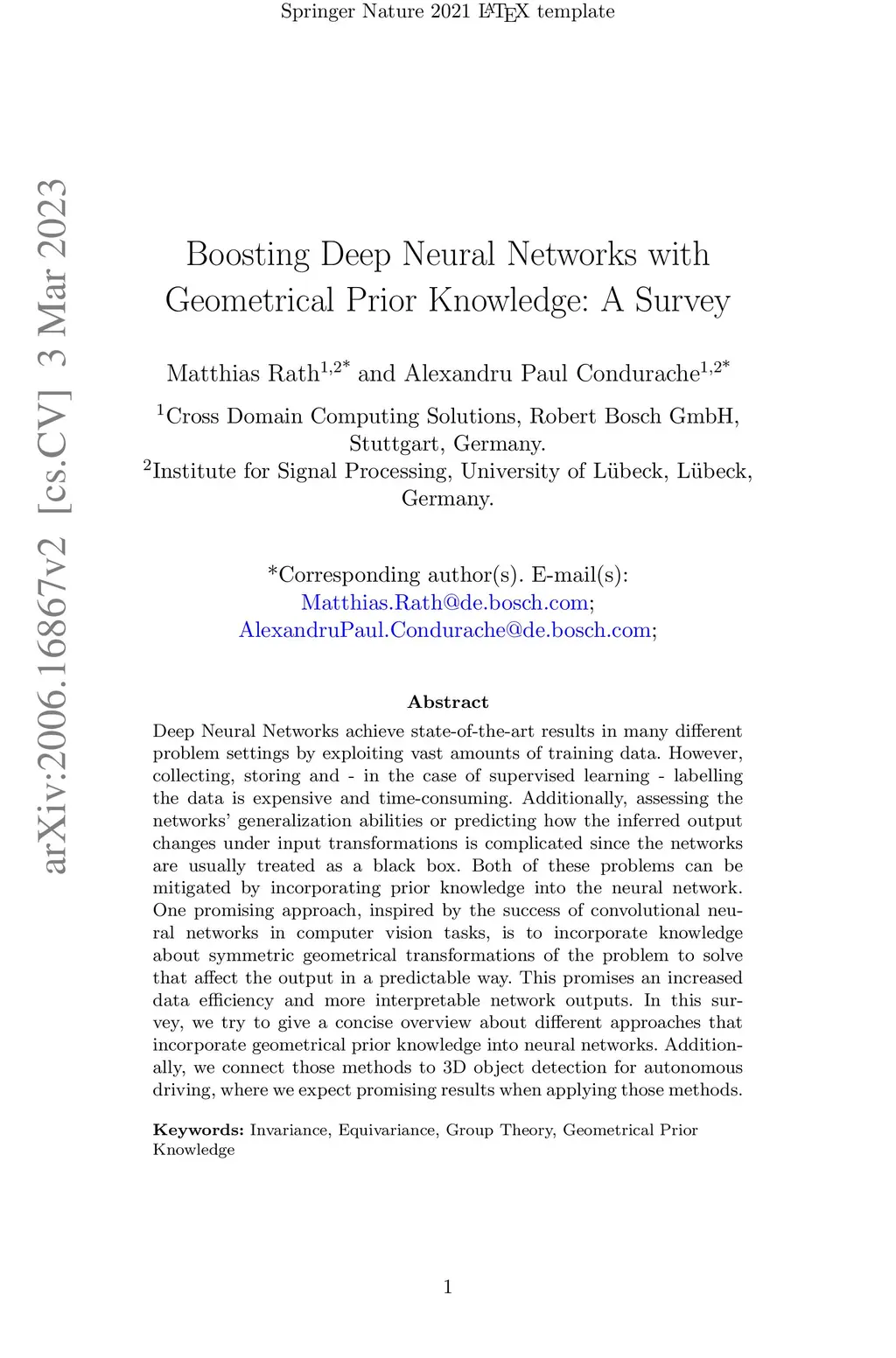 Deep Neural Networks achieve state-of-the-art results in many different problem settings by exploiting vast amounts of training data. However, collecting, storing and - in the case of supervised learning - labelling the data is expensive and time-consuming. Additionally, assessing the networks' generalization abilities or predicting how the inferred output changes under input transformations is complicated since the networks are usually treated as a black box. Both of these problems can be mitigated by incorporating prior knowledge into the neural network. One promising approach, inspired by the success of convolutional neural networks in computer vision tasks, is to incorporate knowledge about symmetric geometrical transformations of the problem to solve that affect the output in a predictable way. This promises an increased data efficiency and more interpretable network outputs. In this survey, we try to give a concise overview about different approaches that incorporate geometrical prior knowledge into neural networks. Additionally, we connect those methods to 3D object detection for autonomous driving, where we expect promising results when applying those methods.